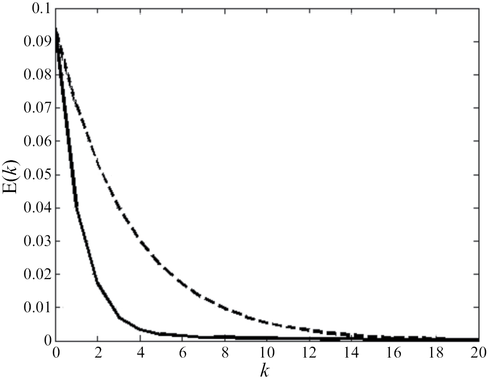 Для алгоритмов второго порядка при τ0 = 1 естественно задавать τ1, не превышающим 1, иначе обновленная информация будет подавляться устаревшей. При 0 < τ1 < 1 получаем ускорение сходимости относительно алгоритма первого порядка. При τ1 > 1 в силу преобладания устаревшей информации происходит нарушение монотонности изменения E(k) и замедление скорости сходимости относительно алгоритма первого порядка. На фиг. 2 представлено сравнение алгоритма первого порядка и алгоритма второго порядка при τ1 = 0.8, при этом