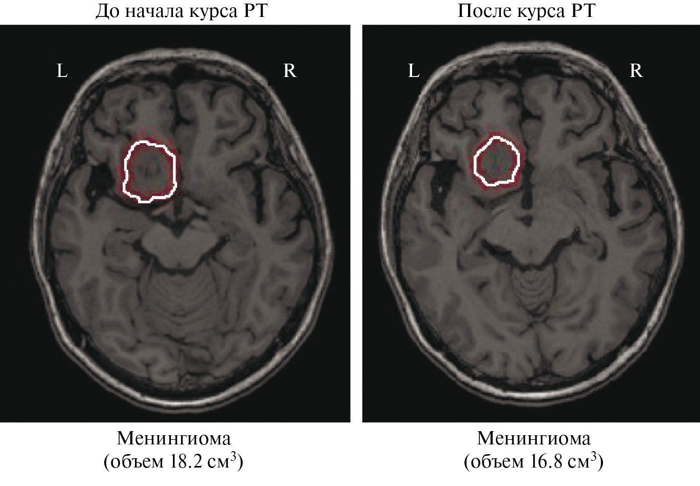 Рис. 2. Пример динамики снижения размеров опухоли после курса РТ. Структурное МРТ одного и того же пациента: до начала лечения (слева) и через 6 мес после РТ (справа). Опухоль на снимках обозначена белым контуром.