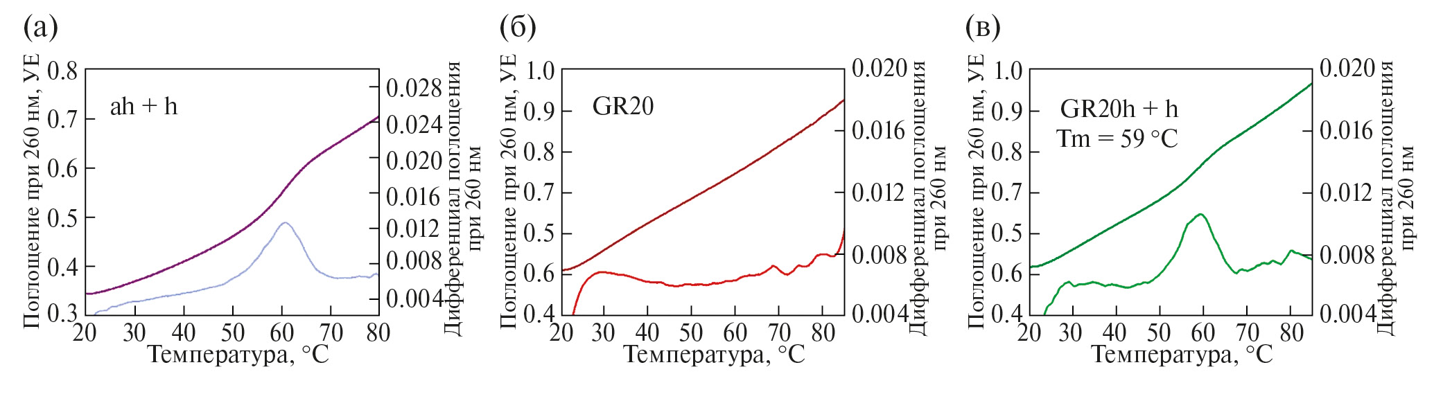 Спектрофотометрический анализ плавления олигонуклеотидов при 260 нм использовали для верификации образования дуплексов ДНК. На кривых плавления дуплекса в 18 пар нуклеотидов ahh наблюдается перегиб (рис. 1 (а)), соответствующий плавлению дуплекса. Обнаружить образование двуцепочечных участков в структуре исходного аптамера GR20 с помощью плавления затруднительно (рис. 1 (б)). Кривая плавления нековалентной конструкции GR20hh соответствовала суперпозиции кривых плавления отдельных элементов – аптамера GR20 и дуплексного модуля (рис. 1 (в)) с Тпл = 59 °C.