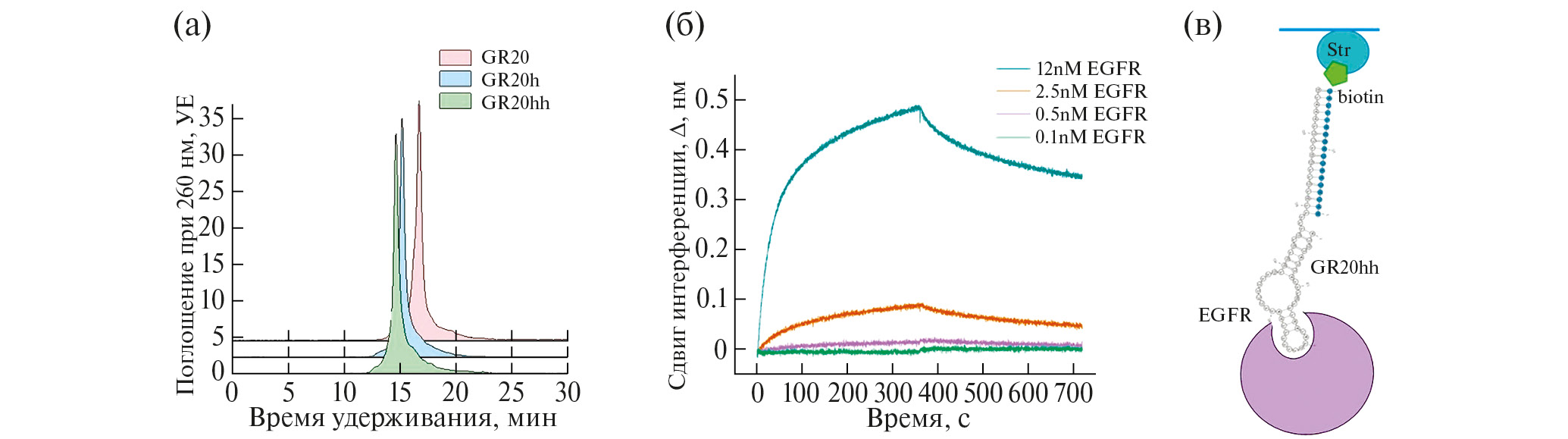 Кинетику взаимодействия иммобилизованного GR20h с рекомбинантным внеклеточным доменом рецептора EGFR изучали методом интерферометрии биослоев. Комплементарный олигонуклеотид h с биотиновой меткой на 5’-конце иммобилизовали на поверхность стрептавидинового сенсора и добавляли GR20h, чтобы собрать конструкцию GR20hh (рис. 2 (б, в)).