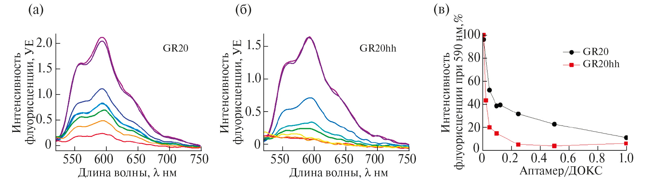 За включением ДОКСа в двуцепочечный участок конструкции GR20hh наблюдали при тушении флуоресценции ДОКСа. Спектры флуоресценции, полученные в ходе титрования ДОКСа исходным аптамером GR20 и конструкцией GR20hh, приведены на рис. 3 (а, б). ДОКС обладает максимумом эмиссии флуоресценции при длине волны 590 нм, при добавлении аптамера или конструкции наблюдалось снижение интенсивности максимума флуоресценции.