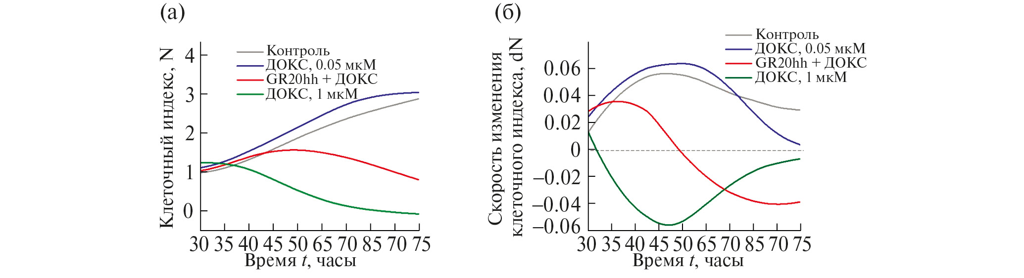 При добавлении 1 мкМ ДОКСа к клеткам наблюдается продолжение роста клеточного индекса в течение 8 ч (рис. 4 (б)). Затем значение производной клеточного индекса становится отрицательным, что отражает начало гибели клеток. Затем скорость гибели клеток увеличивается, что можно объяснить накоплением ДОКСа в клетках. Через 23 ч после добавления ДОКСа наблюдается снижение скорости гибели клеток, что, скорее, связано с уменьшением общего количества живых клеток.