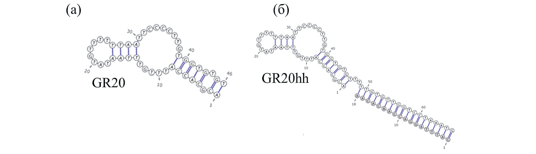 Рис. 5. Возможная вторичная структура аптамера GR20 (а) и конструкции GR20hh (б).