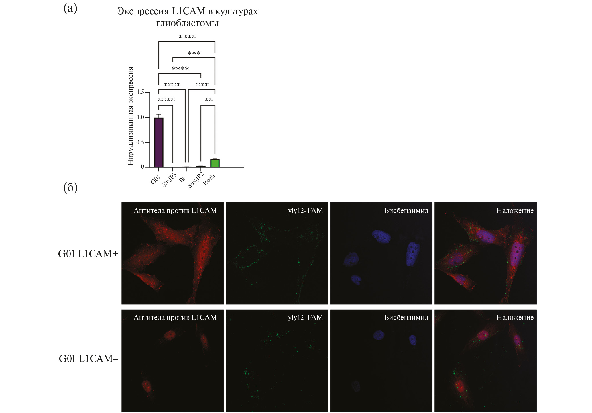 Рис. 1. Экспрессия L1CAM в культурах клеток глиобластомы и аптоцитохимическое окрашивание культур клеток G01 L1CAM+ и G01 L1CAM- антителами против L1CAM и меченым аптамером yly12-FAM. (а) – уровни экспрессии гена L1CAM в клеточных культурах глиобластомы человека G01, Sus\fP2, Bl, Sh\fP3, Rozh. Данные представлены в виде mean ± SD; n = 3 для каждой группы. Статистически значимые различия показаны с помощью астериксов (One-Way ANOVA, post-hoc Tukey HSD Test, ** – p < 0.01, *** – p < 0.001, **** – p < 0.0001). (б) – Аптоцитохимическое окрашивание клеток глиобластомы человека G01 L1CAM+ и G01 L1CAM- аптамером yly12-FAM (зеленое свечение) и антителами против L1CAM (красное свечение). Ядра клеток окрашивали раствором бисбензимида (Hoechst 33342) – синее свечение.