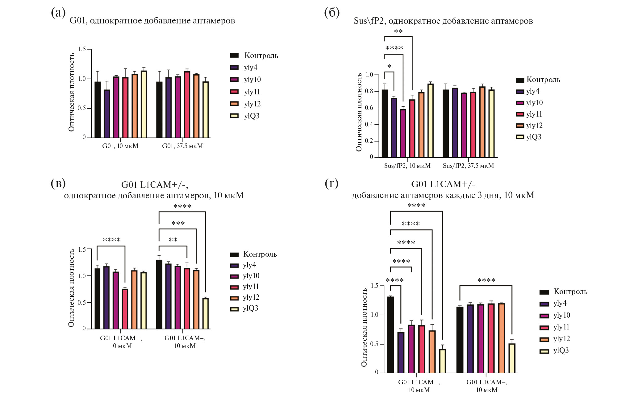 Рис. 2. Результаты MTS-теста при однократном и трехкратном добавлении аптамеров к L1CAM к клеткам глиобластомы человека. МTS-тест на 10-й день после добавления к клеткам глиобластомы (а) – G01, (б) – Sus\fP2 аптамеров к L1CAM yly4, yly10, yly11, yly12, ylQ3 в концентрациях 10 и 37.5 мкМ. МTS-тест на 10-й день после добавления аптамеров к L1CAM yly4, yly10, yly11, yly12, ylQ3 в концентрации 10 мкМ к клеткам G01 L1CAM+ и G01 L1CAM- (в) однократно и (г) каждые три дня. Данные представлены в виде mean ± SD; n = 3 для каждой группы. Статистически значимые различия показаны с помощью астериксов (Two-Way ANOVA, post-hoc Bonferroni test, ** – p < 0.01, *** – p < 0.001, **** – p < 0.0001).