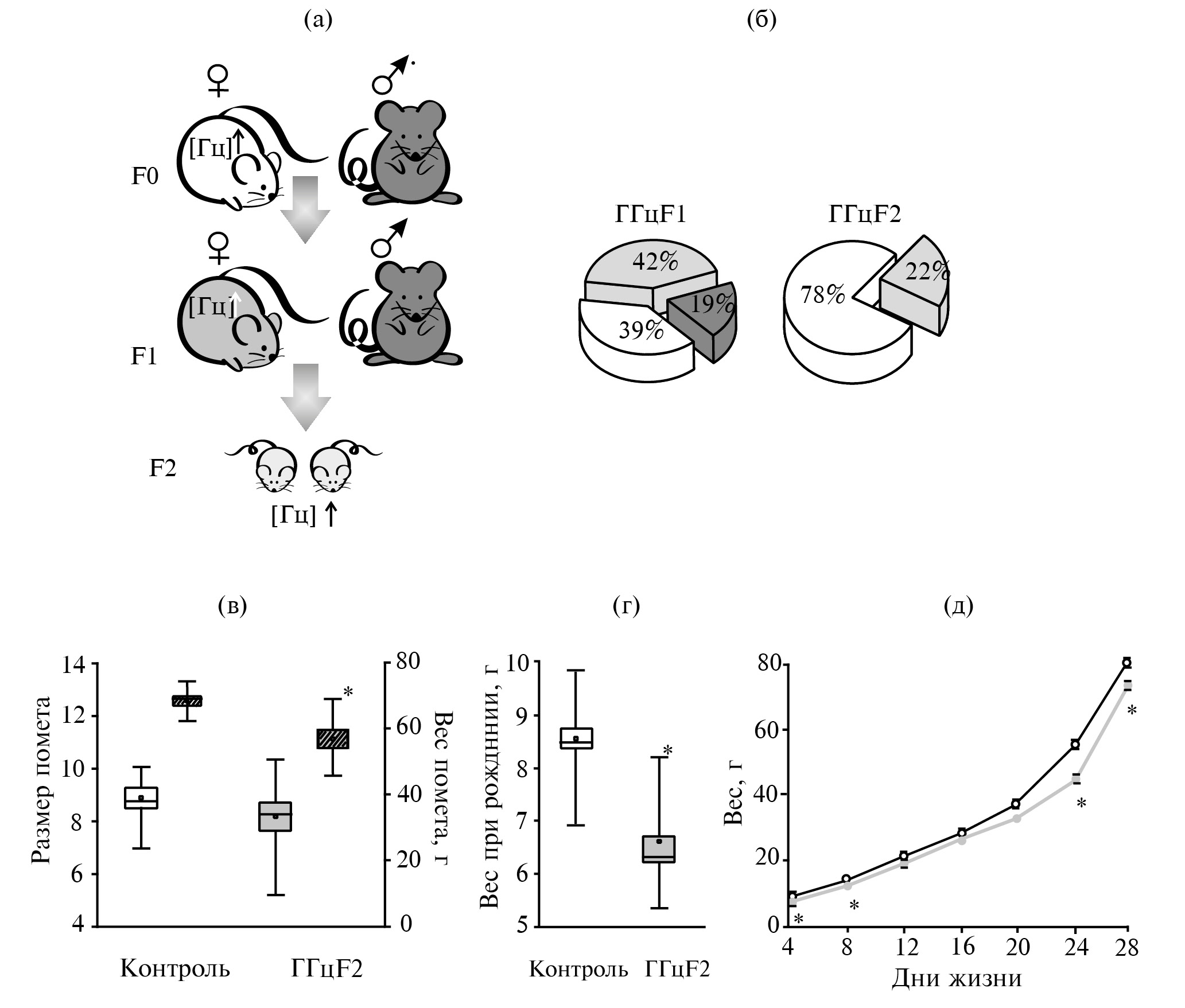 Новорожденные животные из группы ГГцF2 характеризовались меньшей массой тела при рождении (6.5 ± 1.0 г, n = 60, р < 0.05, t-тест), по сравнению с контрольной группой, где масса тела была равна 8.5 ± 0.2 г (n = 53), но количество крысят в пометах ГГцF2 и контрольной группы не отличалось (рис. 1 (в, г)). Общий вес помета в группе ГГцF2 (57.6 ± 11.2 г, N = 8) был ниже, чем у контрольной группы (66.3 ± 1.7 г, N = 6, рис. 1 (в)). Сниженная масса тела потомства группы ГГцF2 сохранялась в течение 4 недель после рождения (рис. 1 (д)).