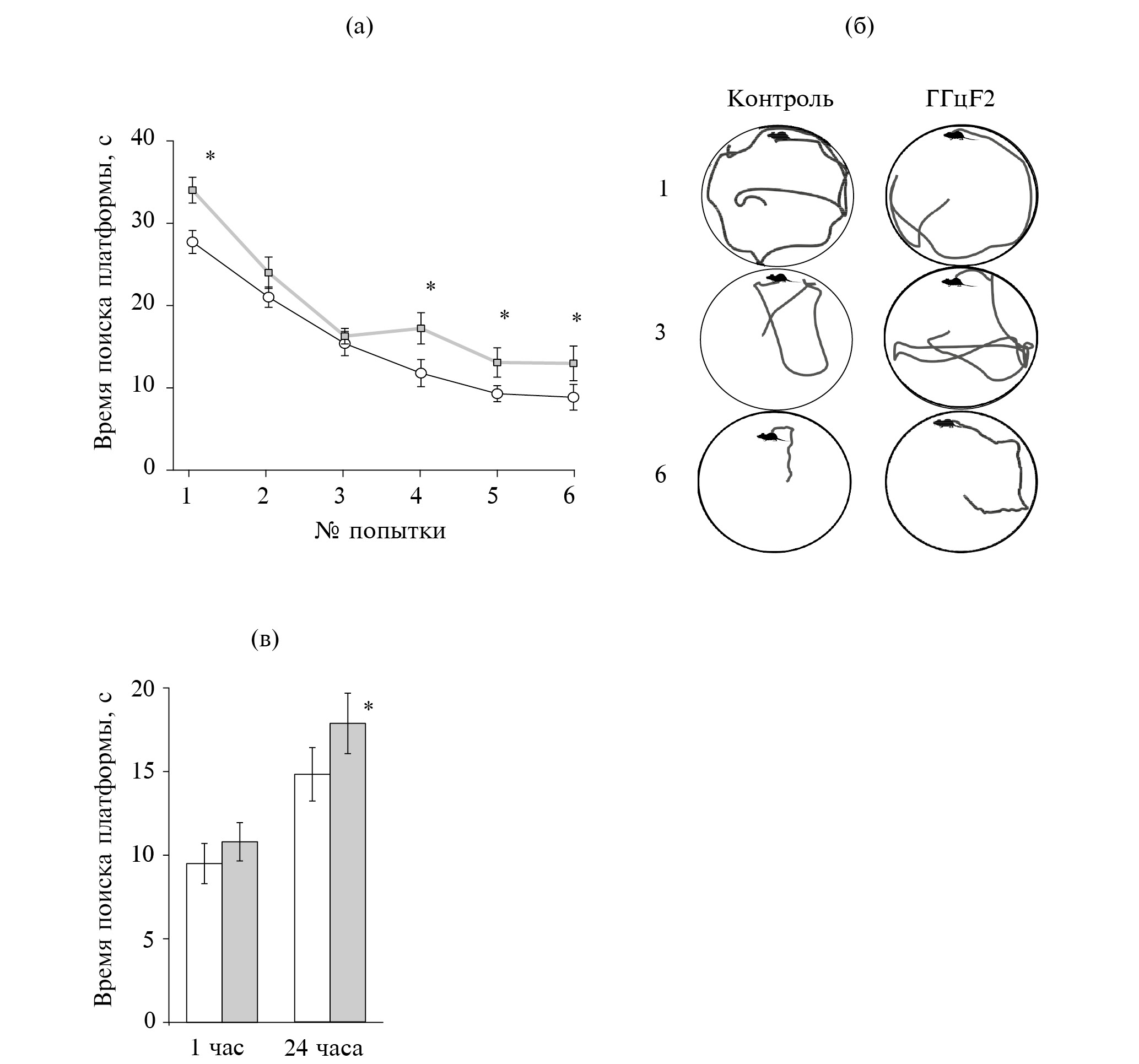 Процесс обучения включал 6 подходов, в ходе которых животное должно было находить скрытую платформу. При обнаружении платформы крысята оставались на ней в течение 30 с. Межиспытательный интервал составлял 15 с. Исходное положение в водном лабиринте было псевдослучайным, если крыса не находила платформу в течение 1 мин, ее осторожно подводили к платформе. Через 1 и 24 ч после обучения крыса повторно опускалась в бассейн, и регистрировалось время нахождения платформы, что позволило оценить нарушения кратковременной и долговременной памяти соответственно.