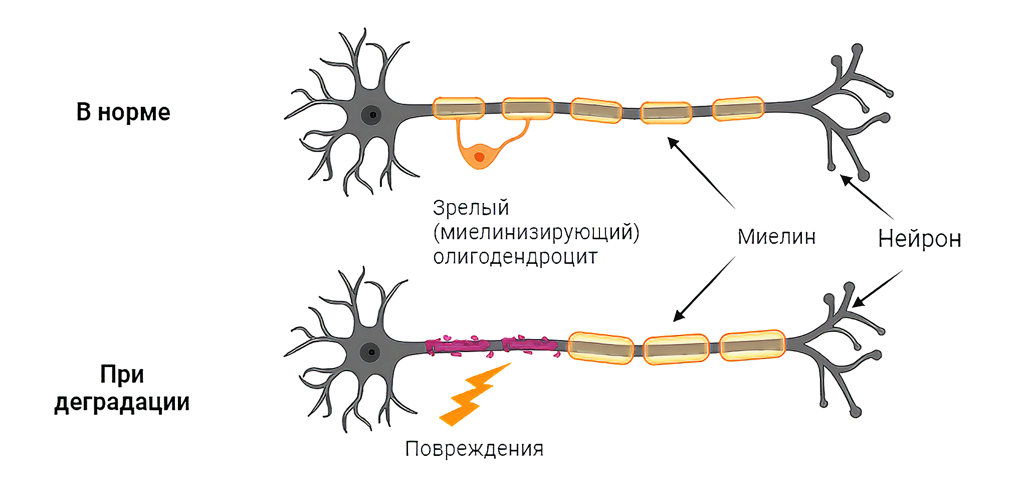 Постепенная потеря миелина является одним из характерных признаков возрастных изменений мозга (Kohama et al., 2012). При патологии происходит нарушение формирования миелина или же его деградация под влиянием как генетических факторов, так и факторов внешней среды (например, дефицит питательных веществ, терапевтические вмешательства, химические и биологические токсины) (рис. 1). Биохимические изменения, связанные с демиелинизацией нейронов ЦНС, как правило, сходны независимо от этиологии (Saab, Nave, 2017), однако сама демиелинизация может быть как причиной, так и следствием патологического процесса. Так, при одних демиелинизирующих заболеваниях сначала происходит избирательная дегенерация миелина или миелинизирующих олигодендроцитов, а затем деградации подвергаются и аксоны. Как правило, данные заболевания имеют иммуноопосредованный или инфекционный патогенез; среди них наиболее распространенным является рассеянный склероз, также встречаются лейкоэнцефалопатии, периферические невропатии и др. В других случаях (лейкодистрофии, болезни лизосомального накопления, наследственные невропатии и т.д.) происходит дегенерация нейронов, приводящая в конечном итоге к их демиелинизации (Garcia-Gil, Albi, 2017). Например, при болезни Альцгеймера потеря миелина аксонами происходит уже на ранних клинических стадиях заболевания задолго до появления первых симптомов (Altevogt et al., 2002; Dean et al., 2017; Papuc, Rejdak, 2020).