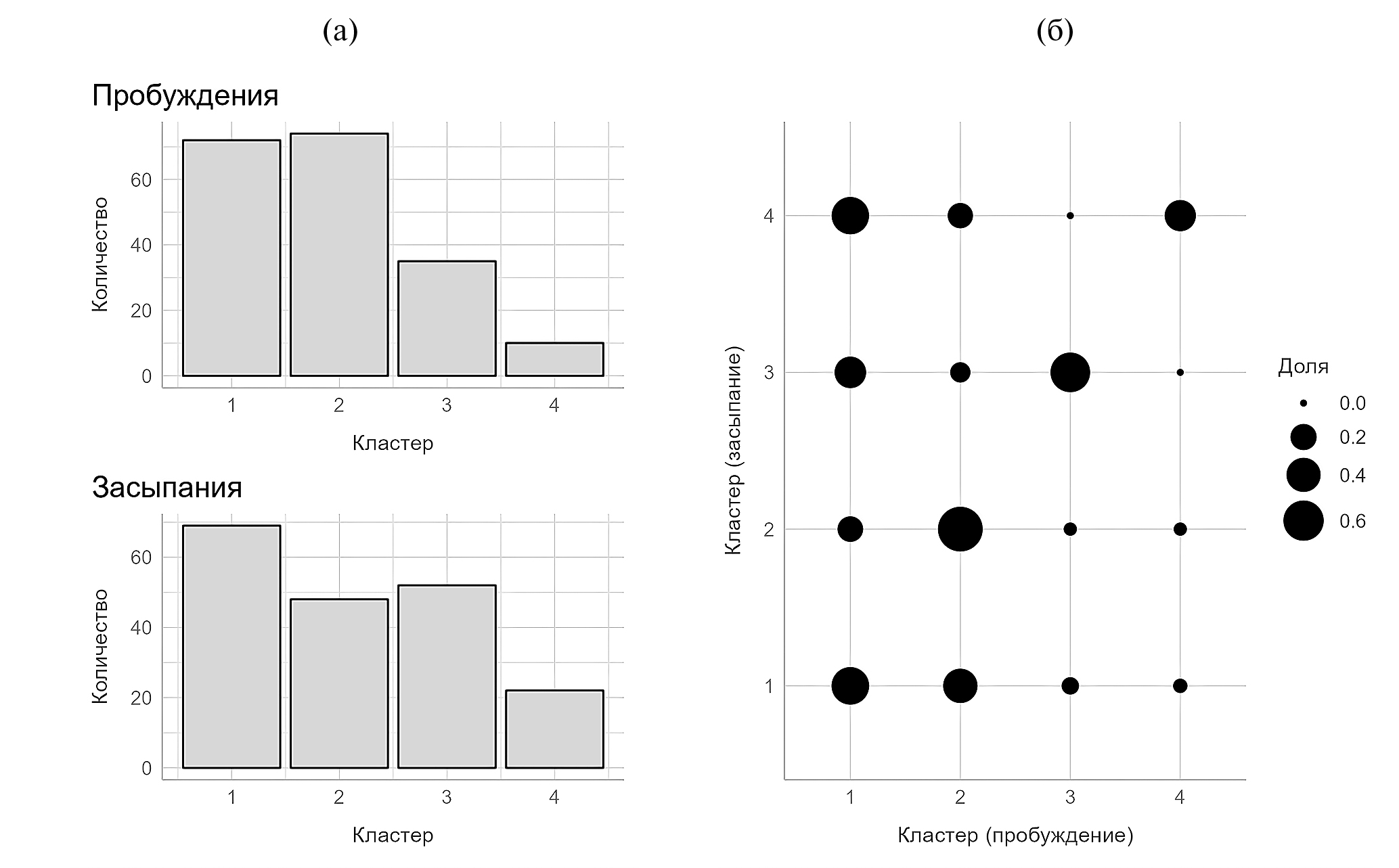 Рис. 3. (а) – размеры кластеров, полученных на основе пробуждений (верхняя часть графика) и размеры аналогичных им кластеров, полученных на основе засыпаний (нижняя часть графика). По оси X представлен номер кластера, по оси Y – количество наблюдений в каждом кластере. (б) – диаграмма, показывающая доли каждого сочетания “кластер засыпания – кластер пробуждения” относительно всех вариантов для каждого кластера засыпания по отдельности. По оси X представлены “кластеры пробуждений”, по оси Y – “кластеры засыпаний”. Диаметром точки кодируется доля – чем больше точка, тем большую долю составляет такое сочетание кластеров.