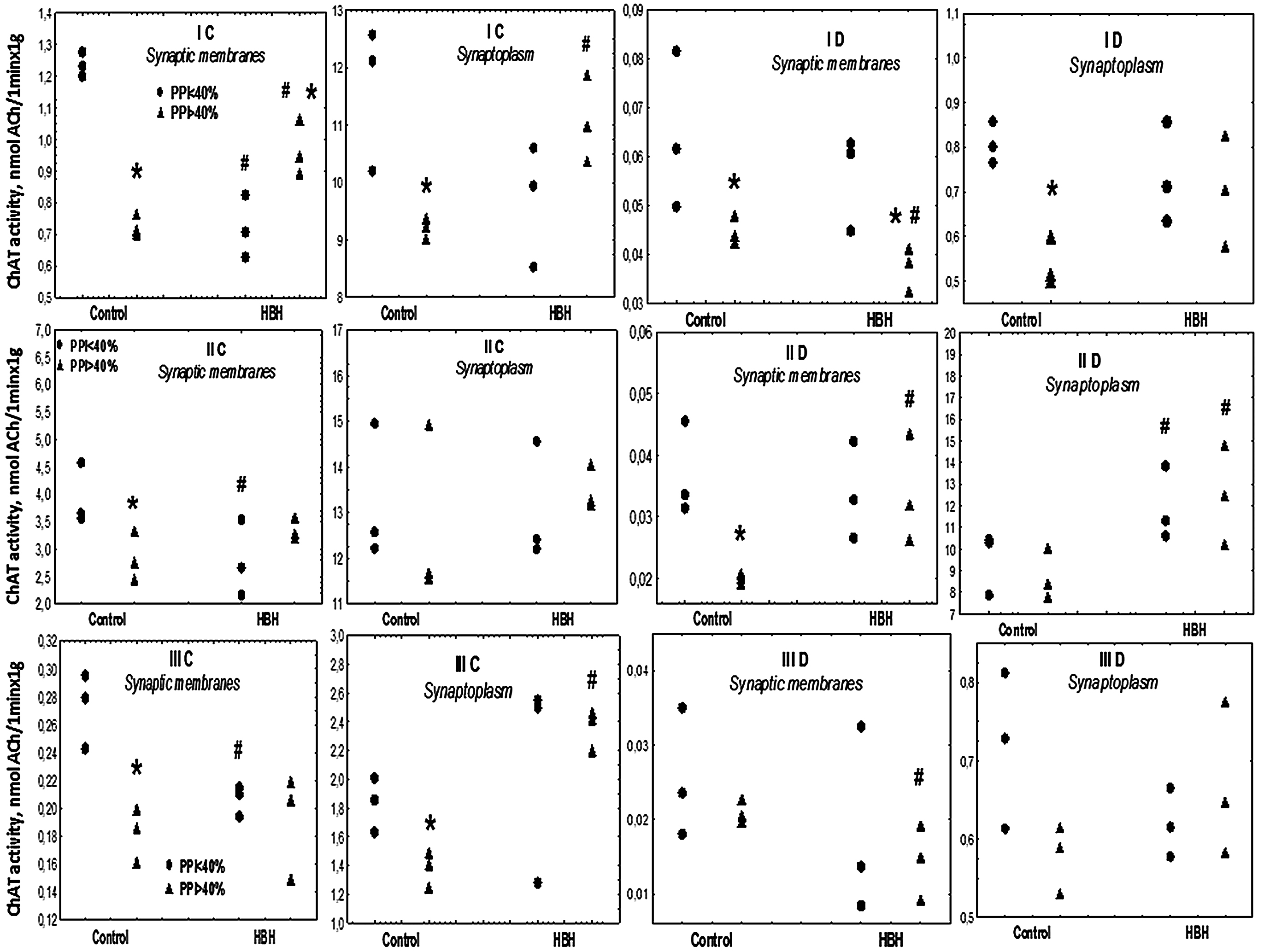 Fig. 1. Individual values of the synaptic ChAT activity in the control and HBH subgroups of rats with PPI values of <40% and >40%. Designations. The ChAT activity is presented in nmol ACh/1 min in 1 g wet weight of the corresponding brain structure. The software package STATISTICA 8.0 (StatSoft., USA) was used to visualize the data. I, hippocampus; II, cerebral cortex; III, caudal brainstem. C, the fraction of light synaptosomes. D, the fraction of heavy synaptosomes. Synaptic membranes, the subfraction of synaptic membranes. Synaptoplasm, the subfraction of the synaptoplasm. Control, the control subgroups of rats. HBH, the subgroups of rats after one-time moderate hypobaric hypoxia (85 mm Hg, equivalent to 11% O2, 60 min). N = 3 for each subgroup. *, the significant differences in ChAT activity values between the paired subfractions of rats with PPI < 40% and PPI > 40%, p < 0.05. #, the significant changes in the ChAT activity values after HBH were compared with the corresponding control subgroup, p < 0.05. Fisher’s exact test (FET criterion).