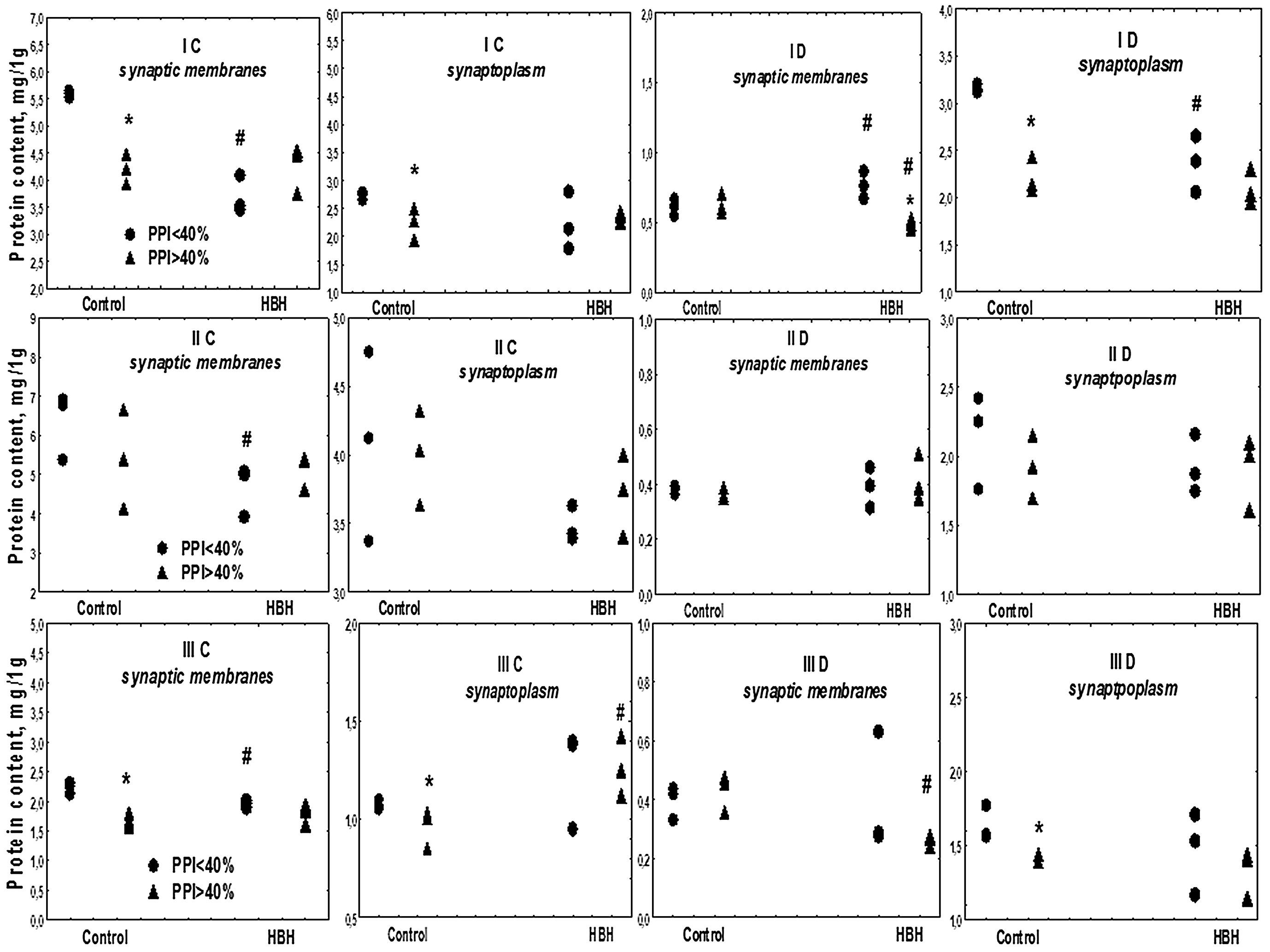 Fig. 2. Individual values of the protein content in the control and HBH subgroups of rats with PPI values of <40% and >40%. Designations. The protein content is presented in mg in 1 g wet weight of the corresponding brain structure.The remaining designations are the same as those in Figure 1.
