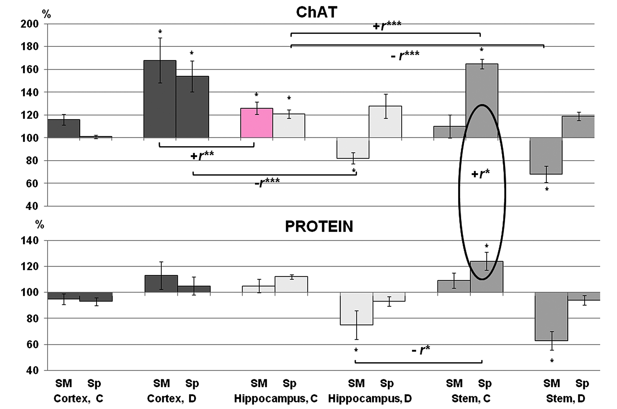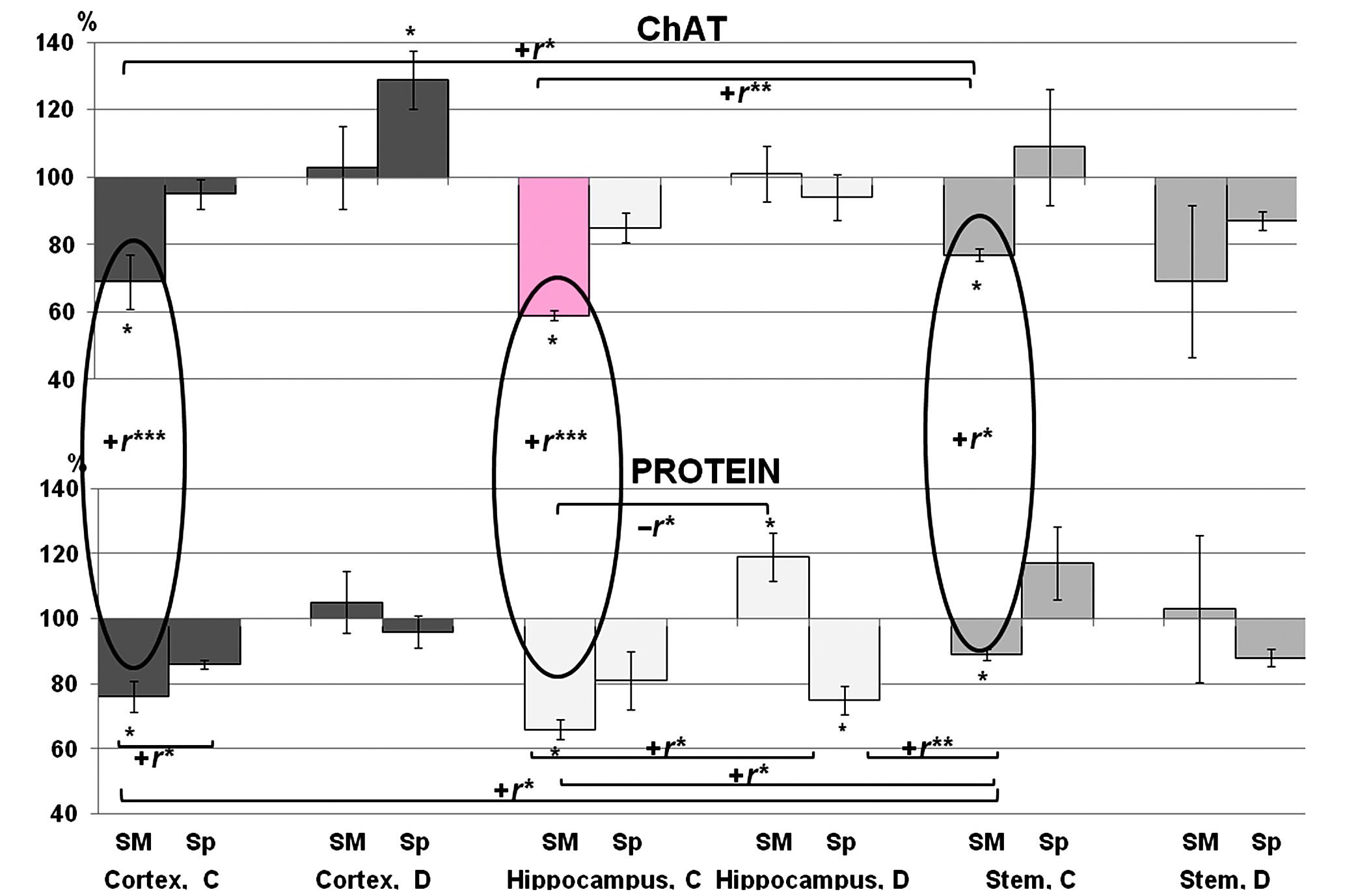 Fig. 3. Conjugacy of HBH-initiated changes in the synaptic ChAT activity and Pr content in the hippocampus, cerebral cortex, and caudal brainstem in rats with PPI < 40%. Designations. The ChAT activity and Pr content values are represented as a percentage change (mean ± SEM%) relative to the values in the corresponding control subgroup, which were taken as 100%. Cortex, the cerebral cortex. Stem, the caudal brainstem. C and D, the fractions of light and heavy synaptosomes, respectively, as in Figure 1. SM, the synaptic membrane subfraction. Sp, the synaptoplasm subfraction. The SM and Sp indicators are shown in pairs according to their belonging to a synaptosome fraction. ChAT, top row, the ChAT activity. PROTEIN, bottom row, the Pr content. Accordingly, in each brain structure, changes in mChAT/mPr values are presented in SM, and changes in sChAT/ sPr values are presented in Sp. For better perception, the indicators of different brain structures (Cortex, Hippocampus, Stem) are presented in different colors (different shades of gray). In the Hippocampus, C, the SM column is highlighted in red in the ‘ChAT’ row, as it is a key indicator for the mechanism of hypoxic preconditioning. *, significant differences from the corresponding control subgroups, p < 0.05, n = 3, Fisher’s exact test (FET-criterion), which for ChAT is similar to the ‘#’ marker in Figure 1. Ovals represent a significant correlation between changes in ChAT activity and Pr content in a subfraction (an intrafractional association), Pearson’s test (r-criterion). Horizontal brackets indicate a significant correlation of indicator changes (ChAT or Pr) between different subfractions (an interfractional and interstructural coherence) according to Pearson’s test (r-criterion). +r/ -r, positive/negative correlation, respectively; r*/ r**/ r***, p < 0.05/ p < 0.02/ p < 0.01, respectively; n = 6 for each sample.