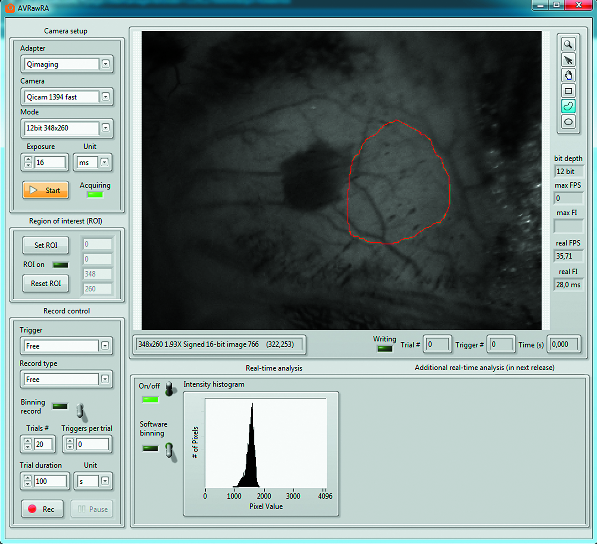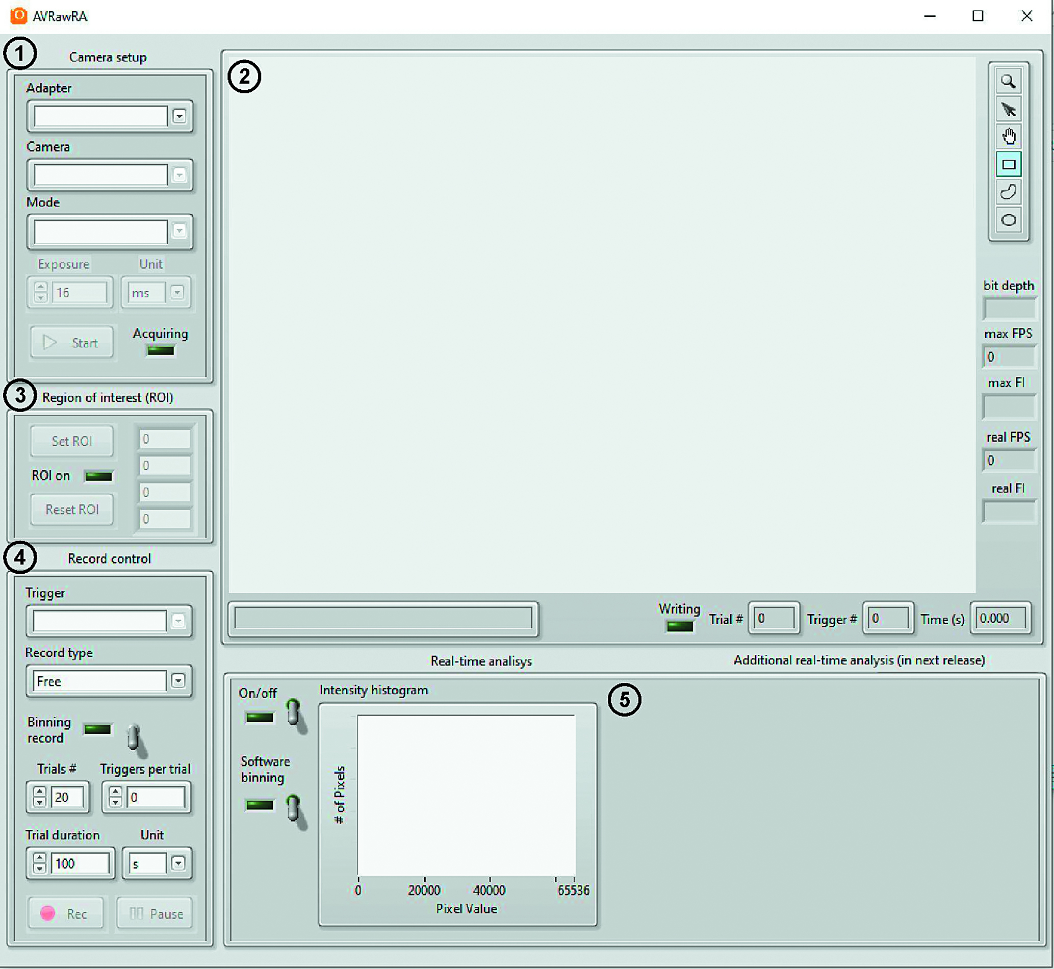 AVRawRA graphical user interface contains panel for setup main camera features, panel for setup region of interest (ROI), panel for the record configuration, panel for real-time image visualization and panel for real-time analysis (Fig. 1).