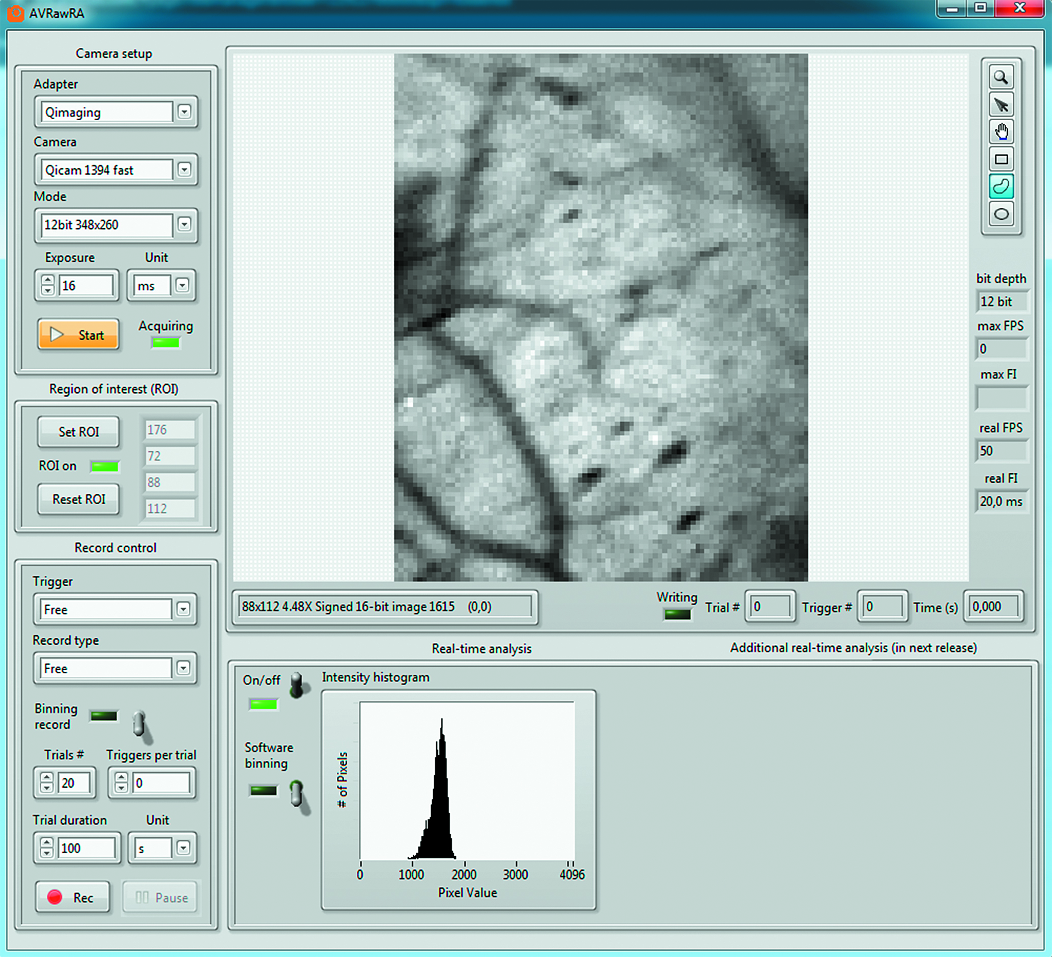 AVRawRA is following a simple workflow. During “Prepare device mode” users select necessary camera device and operation mode and define a frame rate, if possible. Interface for setting acquisition parameters is placed in the Camera setup panel (see “Camera setup” panel). Afterwards, “Acquisition session” is started after pressing the “Start” button (see “Camera setup” panel → “Start” button and “Acquiring” indicator). During “Acquisition session”, the user is able to monitor the real-time image from the camera device (see Real-time image visualization panel), set ROI (see “Region of interest (ROI)” panel) and change camera operation mode and frame rate (see “Camera setup” panel), if necessary. Real-time analysis can be optionally switched on to visualize parameters of the image (see “Real-time analysis” panel) or sequence of images (see Future directions). To move to the “Recording session”, the user should set properties of the record (see “Record control” panel) and press “Rec” button. After the record will be stopped (manually or according to the record parameters), the program state will return to “Acquisition session”. AVRawRA does not allow you to open and view already recorded files. Files with AVI extension can be played in any media player that supports this format (if there are appropriate decoding libraries - codecs). The binary format can be read using any programming language with an implementation for reading binary files (for example, the “fread” function in the Matlab programming environment).