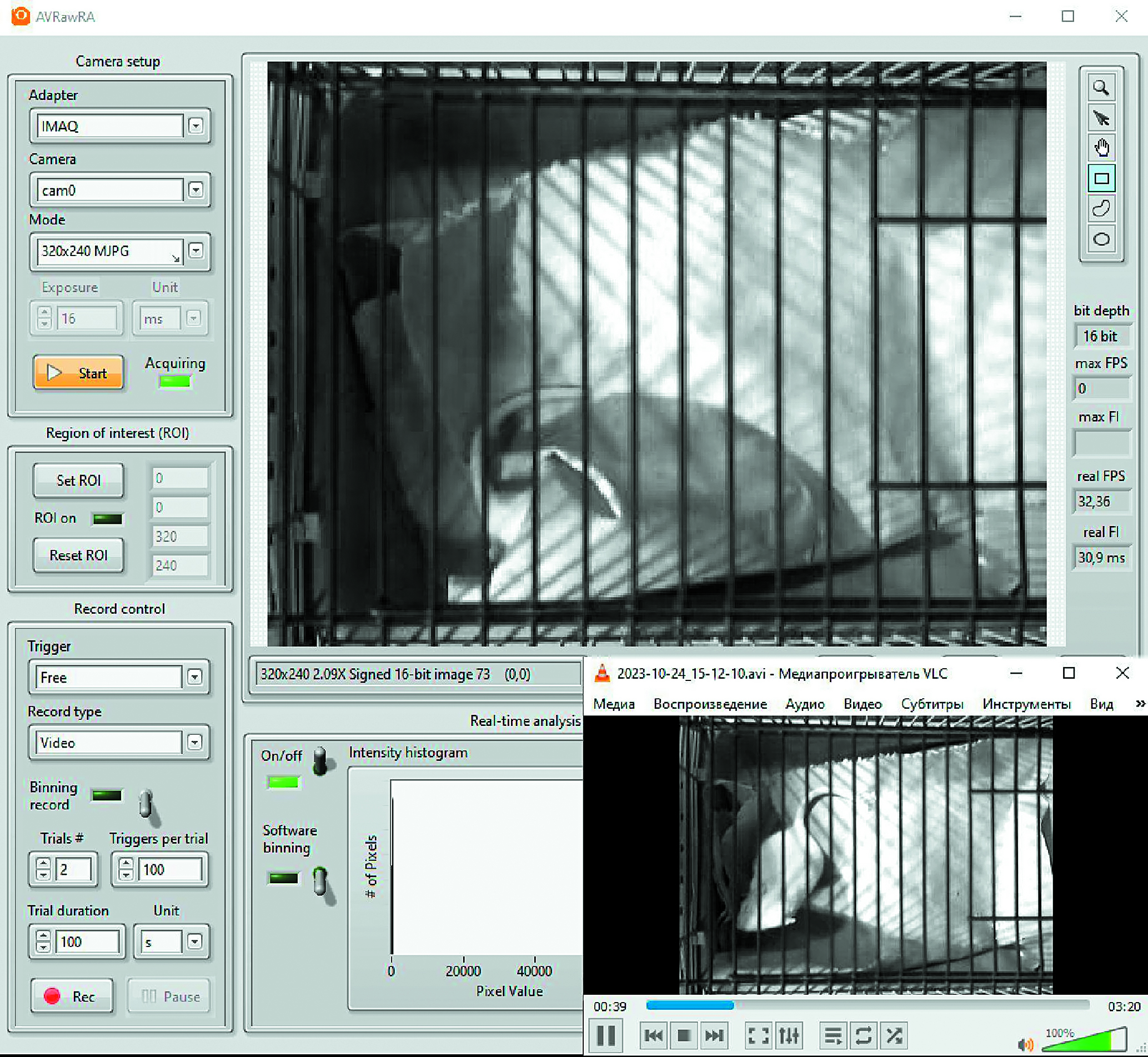 Nowadays, the vast majority of videoregistration equipment (cameras) is provided by manufacturers with their own software. This software allows the user to acquire and store the data in commonly used video formats like *.mp4, *.avi etc. Usage of multimedia compression based also on the suggestion that a human being’s eye’s limitation, that an eye cannot recognize high frequency intensity changes (Venkatesh, 2018; Hubel, 1962). Therefore, reasonable loss of information from the raw image data won’t be detected by our brain. However, changes in the recorded visual image below the eye sensitivity level can contain important and crucial information in scientific applications. In a large amount of neuroimaging research, qualitative description of the neuronal activity critically depends on the spatial resolution, noise/signal ratio and acquisition rate. In calcium imaging, loss of the spatial resolution can affect the following separation of active neurons (Hendel, 2020; de Melo Reis, 2022; Dard, 2022; Oh, 2019; Mues, 2013). Voltage sensitive dyeing can provide a good time resolution of the optical signal from the neuron, while modifying each frame can lead to loss of this advantage (Petersen, 2001; Grinvald, 2004; Baker,2005; Popovic, 2015). In optical intrinsic signal (OIS) imaging the level of beneficial signal reaches only fractions of percents from background intensity and loss of information via compression can lead to absence of results (Aitken, 1999; Vincis, 2015; Suchkov, 2022; Sintsov, 2017). In behavioral studies, videoregistration of animal movements can require high time and spatial precision for correlation to the neuronal activity, with accuracy of several milliseconds (Tiriac, 2015; Akhmetshina, 2016; Inácio, 2016). Therefore, recording video files in raw format is essential for neurobiological research. Sometimes cameras are supported by software, which can have some limitations due to the specialization of the software to the given field of research. That software, in practice, also has low compatibility with other cameras, which prevent usage of the same cameras or software in various applications. Proprietary software, commonly used in non-scientific areas, mostly provide recordings in compressed formats and only for widely used cameras (Salem, 2020). While the cost of the scientific video equipment can reach tangible values, the necessity of the software, which can cover at least basic functions of video acquisition in various research, becomes noticeable. Here we presented an AVRawRA, software, which can provide main functions for video acquisition and recording in raw data format from the large amount of modern cameras, including web cameras. Our software is fully compatible with FireWire (IEEE 1394), GigE (Gigabit Ethernet) and USB cameras (USB3 Vision or DirectShow). AVRawRA allows the user to record video files in several formats, including raw binary (*.bin) and compressed video format (*.avi). According to the technical features of the camera, video recordings can be performed in several modes using both internal and external triggers in various configurations. Frame rate and spatial region of interest (ROI) can be manually regulated if the camera allows that. A basic analysis of intensity included in this version of software to present the opportunity of the real-time analysis without significant loss of the camera time resources.