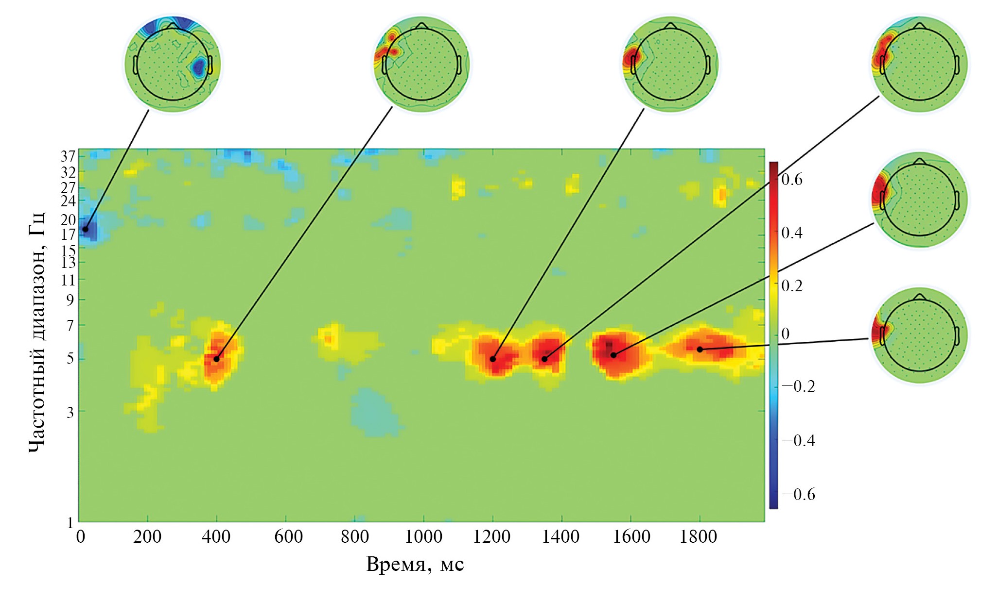 На рис. 1 показаны связанные с событием спектральные пертурбации (СССП) и результат сравнения условий узнавания себя и неузнавания себя во временном интервале от 0 до 2000 мс и в частотном интервале от 1 до 40 Гц. На рис. 2 показаны СССП в распределении по электродам головы в тета-частотном диапазоне (4–7 Гц) и временном интервале от 800 до 1500 мс в условии узнавания себя и условии неузнавания себя.