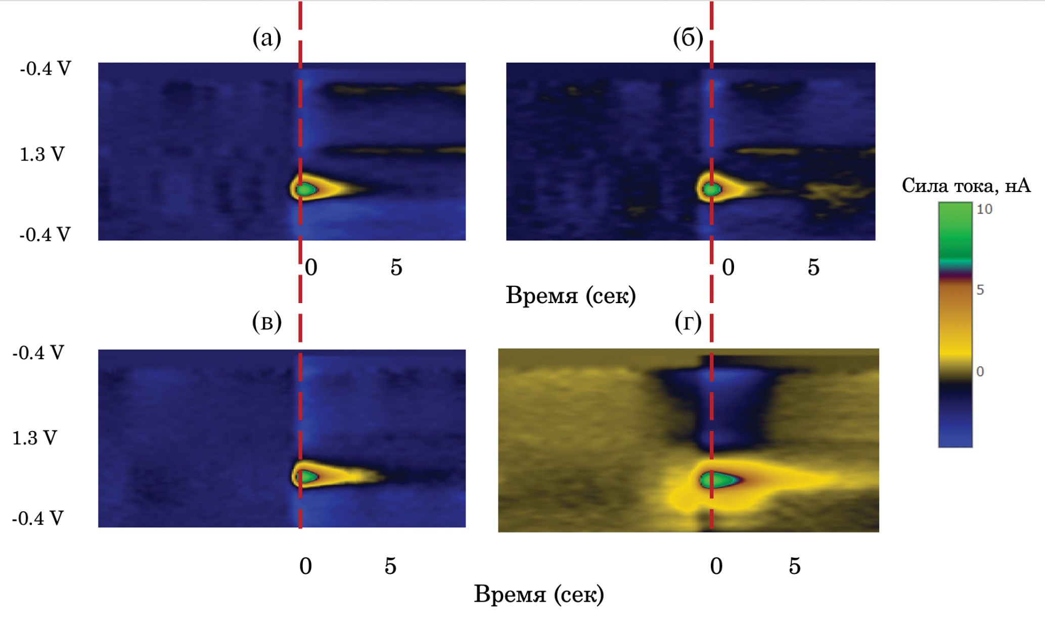 Fig. 5. Voltamperogram in response to VTA stimulation. The color scale reflects the magnitude of the change in electrical current compared to its level at point 0 on the time axis. a – voltammogram of control GR animals; (б) – voltammogram of IS animals; (в) – voltammogram of control GR animals after presentation of a conditioned signal, which was used during training in the maze; (г) – voltammogram of IS animals after presentation of a conditioned signal, which was used during training in the maze GR (n6) and IS (n5)