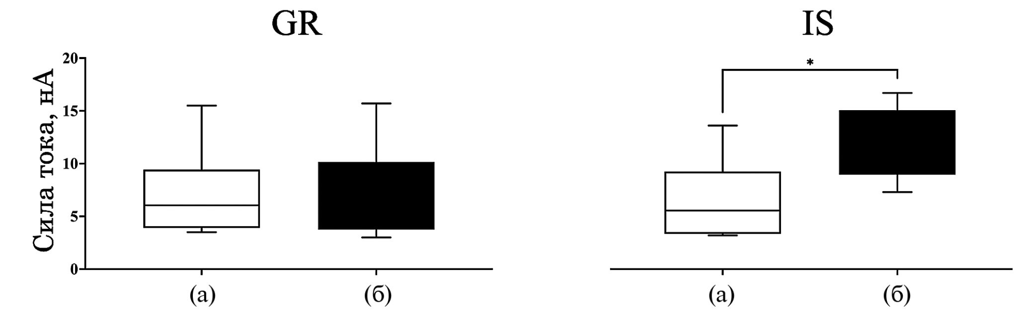 Примечание. Вызванное увеличение амплитуды высвобождения дофамина, нормализованное до среднего пика в NAc при электрической стимуляции VTA у IS (б) и контрольных GR (а) животных. Данные представлены в виде медианы (25–75-й процентили). * — р < 0,05 достоверные различия между группами GR и IS по критерию Манн–Уитни. (а) – кинетика высвобождения дофамина в ответ на стимуляцию VTA без подачи с условного сигнала. (б) – кинетика высвобождения дофамина в ответ на стимуляцию VTA после подачи условного сигнала, который применяли в лабиринте.