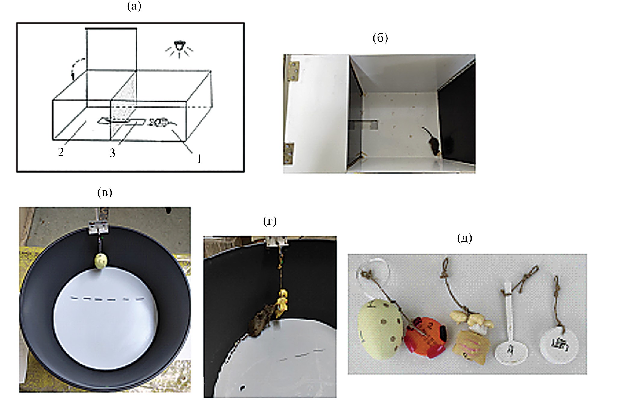 Рис. 1. (а) – схема установки для теста на поиск входа в укрытие: 1 – ее светлая часть, 2 – темная часть, 3 – лаз, их соединяющий, который может быть замаскирован стружкой вровень с полом или закрыт легкой «пробкой». (б) – фото экспериментальной камеры для теста ПВУ с мышью, (в) – фото экспериментальной камеры для теста на внимание, (г) – мышь около предмета, (д) – набор предметов, использованных в тесте