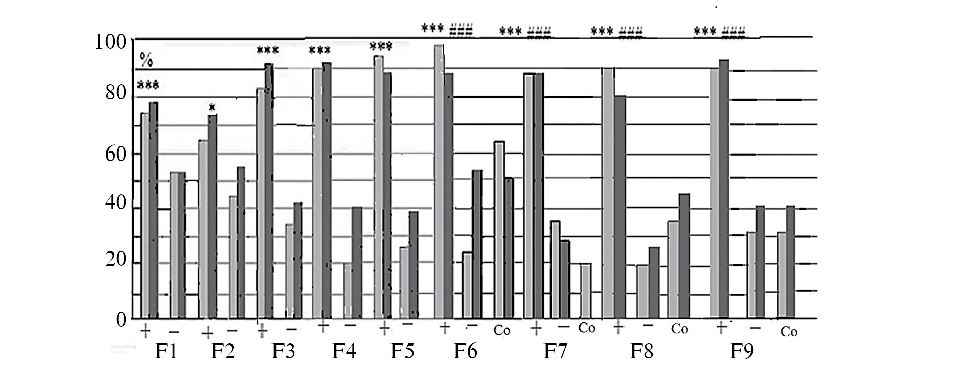 Fig. 2. The proportions of animals (%, ordinate) in the course of selection (F1-F9), which solved successfully the stages of puzzle-box test, when the underpass was blocked by a plug. The sign “+” – the scores for “plus” strain, “-” – for “minus” strain. Co – the scores of mice from control non-selected population. The first test presentation with a “plug”– light grey columns, the second “plug” presentation – dark grey columns. *, *** – the statistically significant differences from scores of “minus” strain, ### – differences from control population scores, p < 0.05 (Fisher φ test for alternative proportions differences)