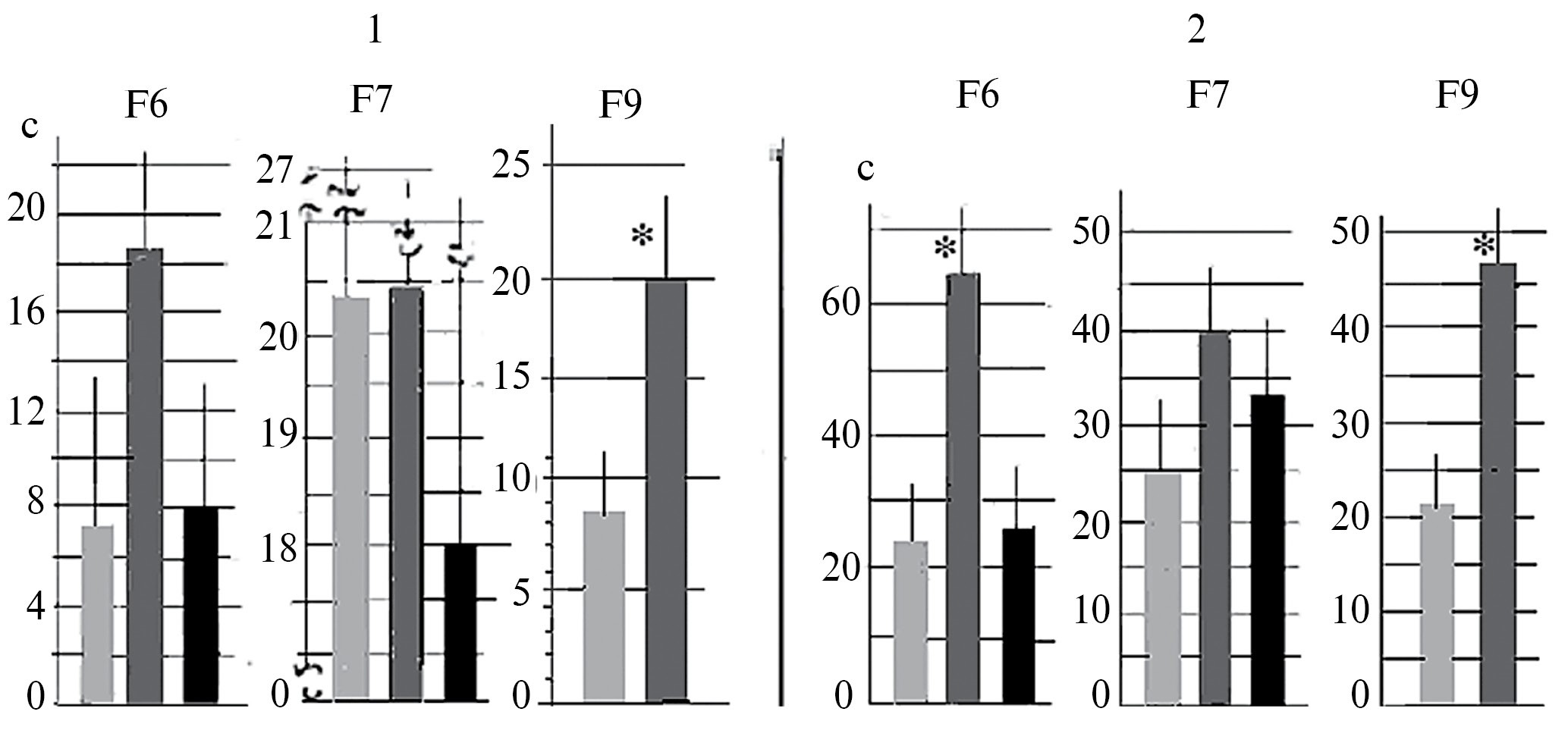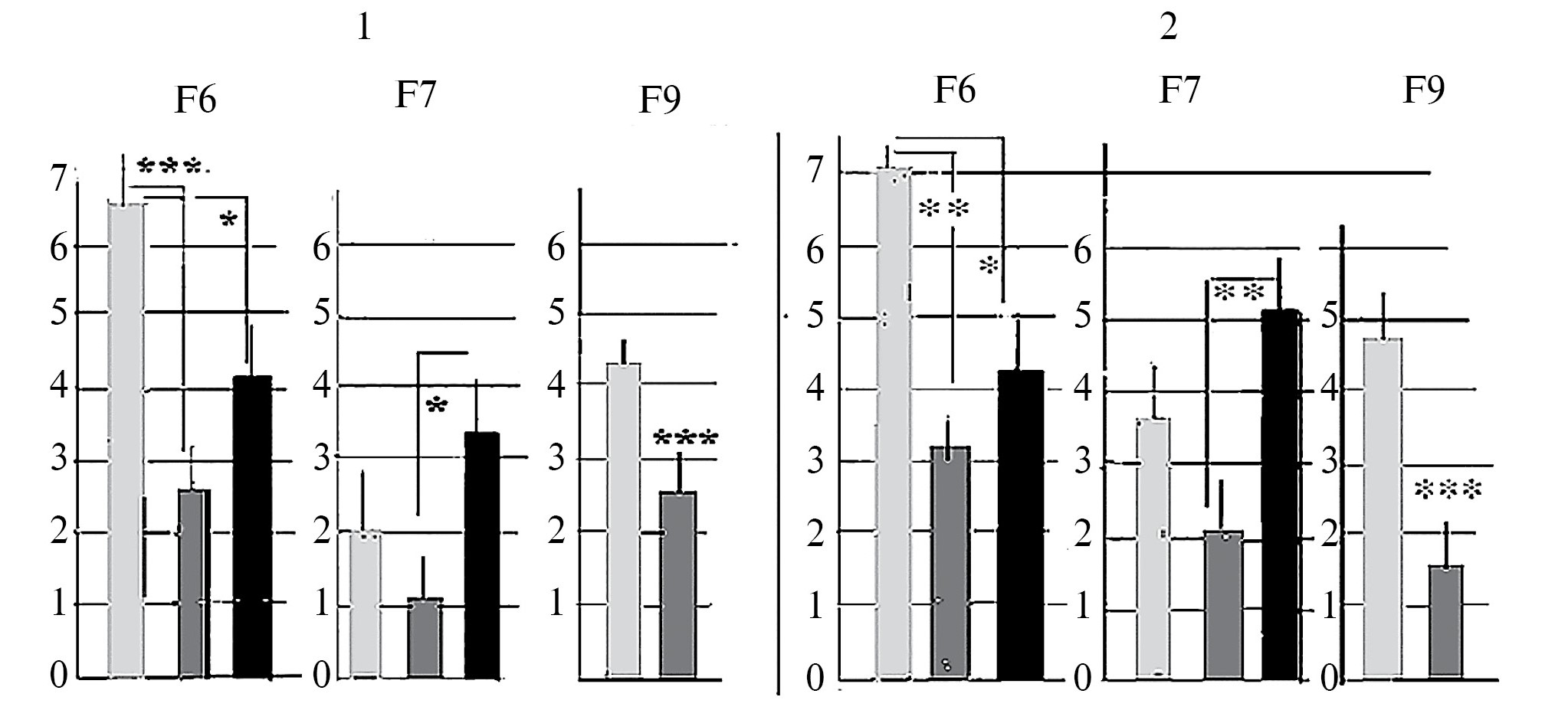 Рис. 5. Числа (ось ординат, ср ± ош. средн.) контактов с предметом у мышей F6, F7 и F9 за 40 с его движения по периметру камеры. 1 – предмет, показанный первым, 2 – предмет, показанный пятым. Обозначения как на рис. 3