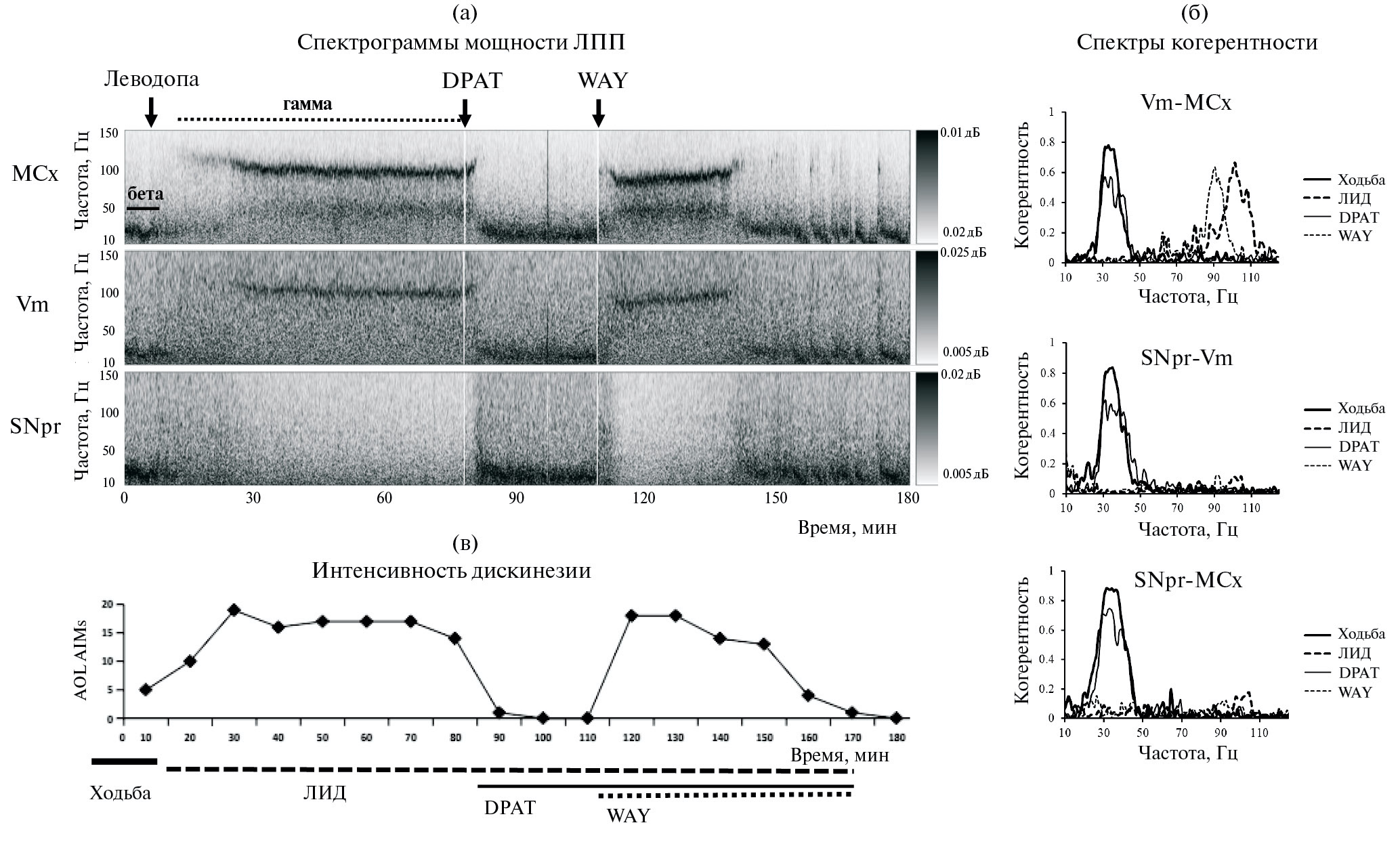 Рис. 1. Эффекты агониста и антагониста серотонинергических 5-HT1A-рецепторов на высокочастотную гамма-активность и дискинезию на примере 3-часовой записи с одного животного. (а) – типичные частотно-временные вейвлет-скалограммы спектральной мощности в записях ЛПП в MCx (вверху), Vm (в центре) и SNpr (внизу) во время ходьбы, после введения леводопы, после введения DPAT (~85 мин после введения леводопы) и антагонистa 5-HT1A-рецепторов, WAY, через 20 мин после DPAT. Маркировка спектральной мощности представлена в виде полосы справа как отношение сигнал/шум (дБ), при этом более высокиe значения мощности обозначены темным цветом. (б) – спектры когерентности в парах MCx–Vm (вверху), Vm–SNpr (в центре) и MCx–SNpr (внизу). Графики построены для 60-секундных периодов записи, представленной на (а) при ходьбе до введения леводопы (сплошная линия, толстая), во время ЛИД (штрих-линия, толстая), после введения DPAT (сплошная линия, тонкая), после введения WAY (штрих-линия, тонкая). (в) – оценка интенсивности дискинезии в величинax ALO AIMs. Отметим, что DPAT снижал мощность гамма-осцилляций в MCx и Vm, когерентность осцилляций между MCx и Vm и устранял дискинезию, восстанавливая бета-частотные осцилляции (30–36 Гц) и брадикинезию. В то время как WAY восстанавливал гамма-осцилляторную активность и дискинезию.