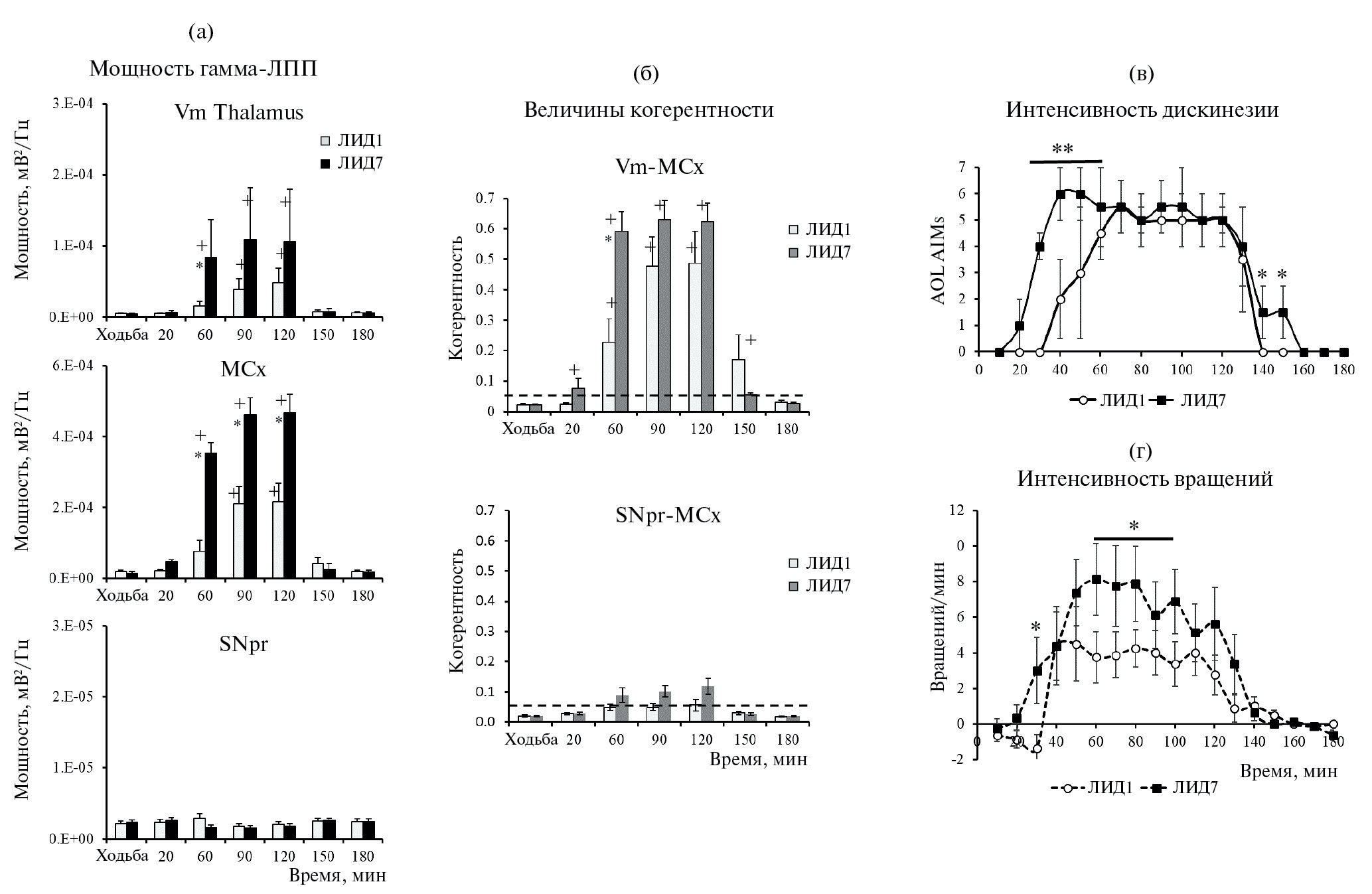 Рис. 2. Высокочастотная гамма-осцилляторная ЛПП-активность в MCx, Vm таламуса и SNpr в первый и седьмой дни введения леводопы. Столбцы на (а) представляют величины средней суммарной мощности высокочастотныx гамма-осцилляций ЛПП MCx (в середине), Vm (вверху) и SNpr (внизу). Столбцы на (б) представляют величины когерентности в парах MCx–Vm (вверху) и MCx–SNpr (внизу) в дни 1 (белый цвет) и 7 (светло-серый цвет) праймирования леводопой. (в): линейные графики отображают показатели ALO AIMs в дни 1 (светлые кружки) и 7 (черные квадраты) праймирования. (г): линейные графики отображают число вращений в цилиндре в дни 1 (светлые кружки) и 7 (черные квадраты). Для построения графиков (а) и (б) были взяты 60-секундные эпохи записей ЛПП вo время ходьбы до введения леводопы и шести периодов после введения леводопы, соответствующие началу (20 мин), пику (60, 90 и 120 мин) и завершению (150 и 180 мин) дискинезии. Отметим, что увеличение мощности и когерентности высокочастотнoй ЛПП-гамма-активности и ALO AIMs было больше на 7-й, чем в первый день введения леводопы. На (а) и (б) – * – различия мощности ЛПП и когерентности между 1-м и 7-м днями введения леводопы (p < 0.05); + – достоверные различия по сравнению с периодом ходьбы в тредмилле (p < 0.05). Пунктирная линия в (б) обозначает порог значимости для усредненных значений когерентности. На (в) и (г) – * – различия по величинам ALO AIMs (p < 0.01) и количеству вращений (p < 0.05) между ЛИД1 и ЛИД7.