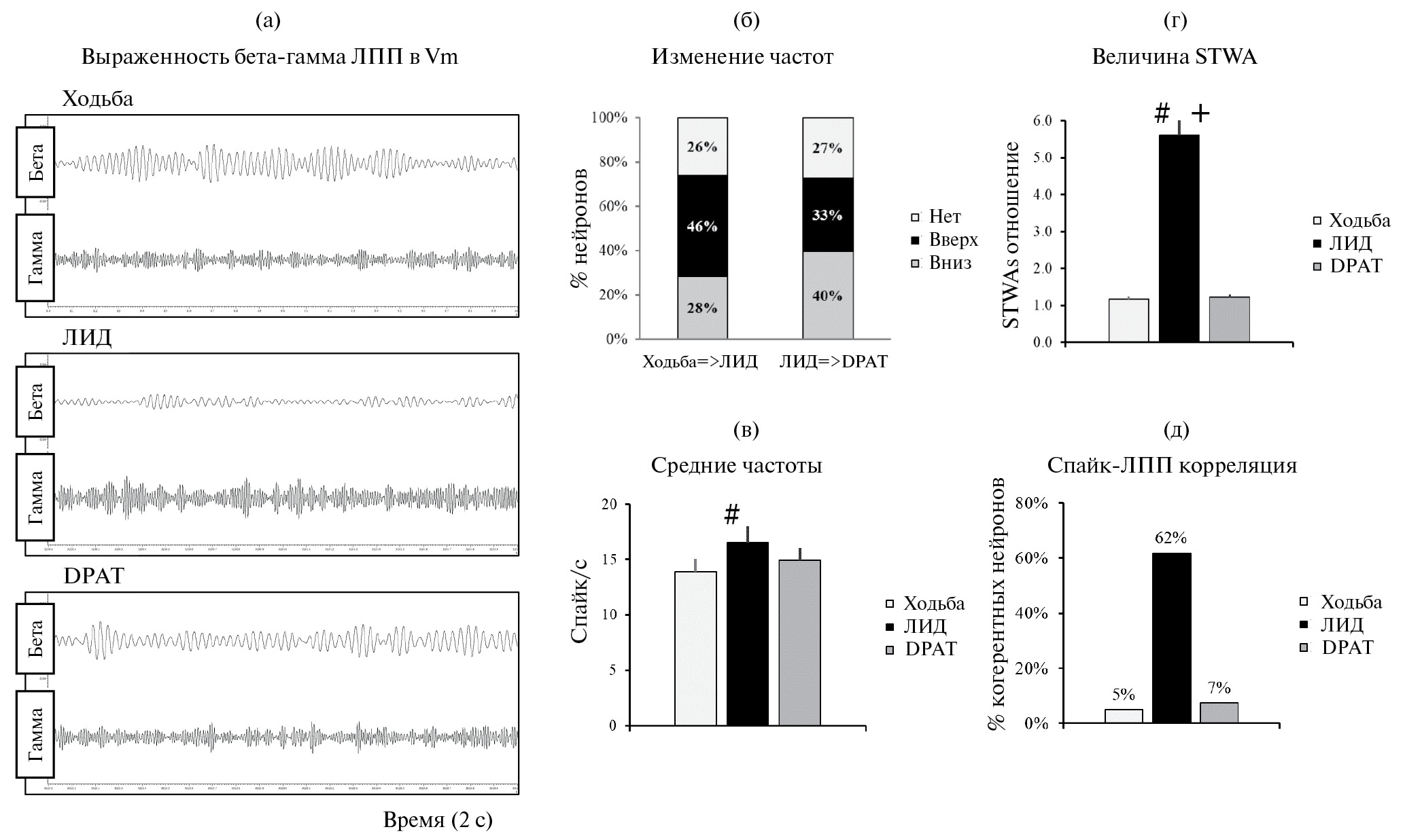 Рис. 3. Изменения частот активности нейронов вентромедиального ядра таламуса при ЛИД и фазовой синхронизации их спайков с ЛПП MCx. (а) – осцилляторная активность ЛПП в Vm в 3 последовательных записях до, после введения леводопы и DPAT. Необработанные сигналы (длительность 2 с) отфильтрованы в выбранных диапазонах частот – бета (30–36 Гц) и гамма (80–120 Гц). ЛПП бета- и гамма-осцилляции перед введением леводопы (верхняя вставка); в период ЛИД (средняя вставка) и после введения DPAT (нижняя вставка). (б) – изменение частот нейронной активности в 3 состояниях на популяционном уровне. Левый столбец представляет изменение частот при ЛИД в сравнении с периодом ходьбы до введения леводопы. Правый столбец представляет изменения частот при переходе от ЛИД к DPAT. Цвет столбцов определяет направление изменения характеристики: возрастaние (черный), снижение (серый) или отсутствие изменений (светло-серый). (в) – частота активности нейронов (спайк/с) до введения леводопы, при ЛИД и после DPAT. (г–д) – синхронизация cпайков с ЛПП в моторной нейросети: (г) – средние отношения амплитуд STWAs, характеризующие спайк-ЛПП-синхронизацию до введения леводопы, во время ЛИД и после введения DPAT; (д) – % нейронов, имеющих выраженную спайк-ЛПП-синхронизацию до введения леводопы, при ЛИД и после введения DPAT. Для (в), (г) и (д) две эпохи (по 100 с) взяты для одних и тех же идентифицированныx нейронов в трех последовательных записях – ходьбе до введения леводопы (светло-серые столбцы), во время ЛИД (черные столбцы) и после введения DPAT (серые столбцы). Значения представлены в процентах или в виде среднего значения ± SEM. # – различия с данными, полученными при ходьбе до введения леводопы; + – различия с данными, полученными после введения DPAT.