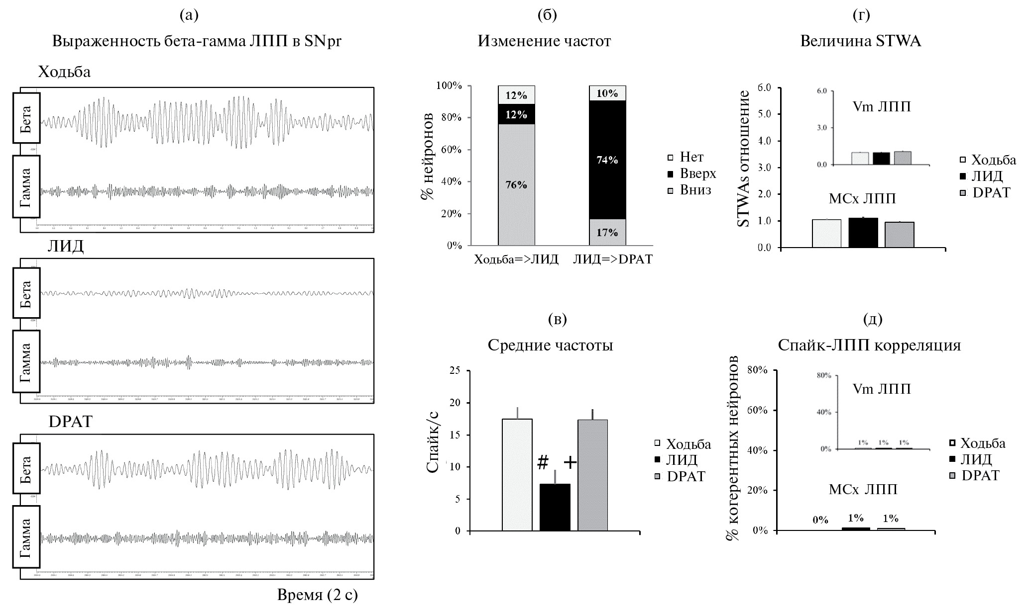 Аналогично Vm и MCx, в SNpr, выходном ядре базальных ганглиев, доминирующая 30–36-герцевая бета-осцилляторная активность при ходьбе у крыс с экспериментальной БП устранялась инъекциями леводопы и восстанавливалась после введения DPAT (рис. 1 (а)). Однако, в отличие от Vm и MCx, в ЛПП SNpr не выявлeны высокочастотные гамма-осцилляции, когерентные с активностью в Vm и MCx во время дискинезии (рис. 2 (а, б)). Отметим, что активность 99% клеток в SNpr не коррелировалa с гамма-осцилляциями ЛПП MCx (рис. 5 (г), 5 (д); 84 нейрона; 7 крыс; p > 0.05) и Vm (вставка на рис. 5 (г), 5 (д)). Однако в SNpr наблюдались наиболее выраженные и устойчивые различия между исходной активностью клеток, при ЛИД и после введения DPAT. В частности, активность в большинстве SNpr-нейронов (76%) значительно снижалaсь во время ЛИД и полностью (рис. 5 (б), 5 (в)) восстанавливалась после введения DPAT (17.5 ± 1.9 во время ходьбы, 7.3 ± 0.6 при ЛИД и 17.3 ± 1.1 после DPAT; p < 0.001).