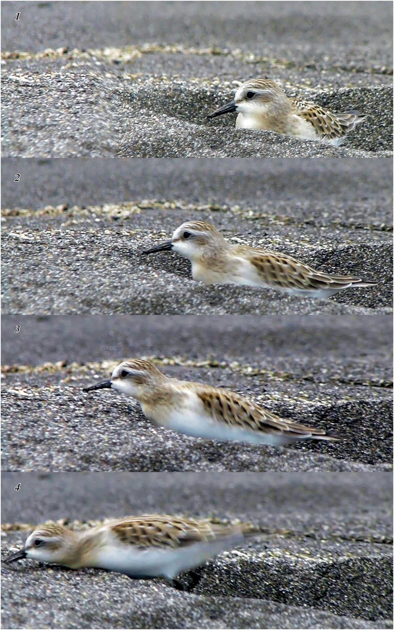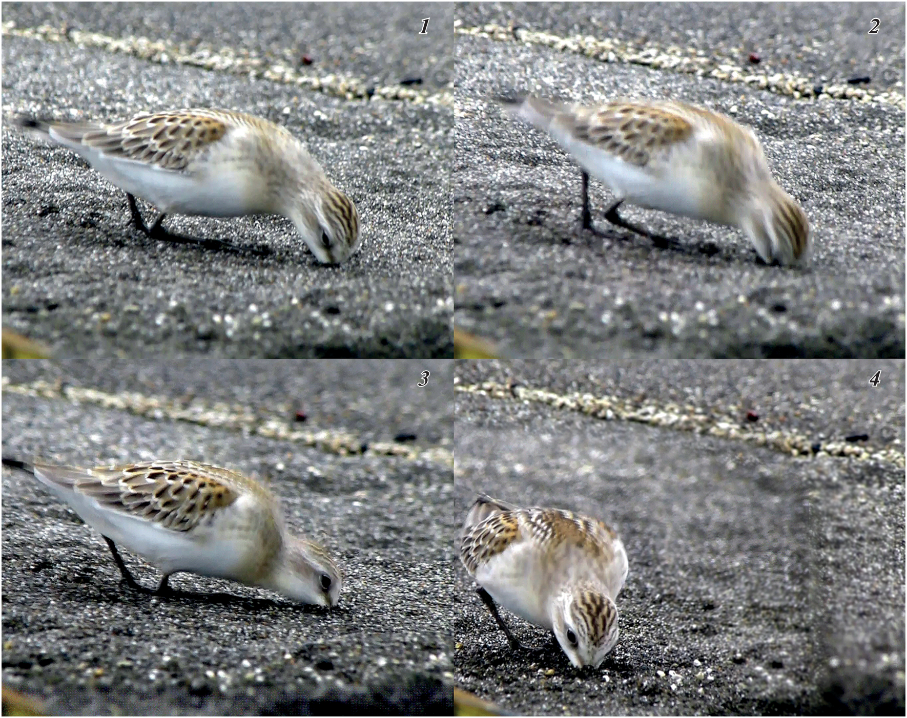 The foraging behaviour of the Red-necked stint (Calidris ruficollis, Scolopacidae, Charadriiformes) was analyzed in detail. The observations were carried out by the authors on the coasts of the Sea of Okhotsk near Magadan and Ola (August 2010), and on Urup Island, Kuriles (August-September 2021, as part of the complex expedition of the second field season “Eastern Bastion – Kuril Ridge”, organized jointly by the Expeditionary Center of the Ministry of Defense of the Russian Federation and the Russian Geographical Society. The diversity of stint species-specific feeding techniques was assessed, and their list compiled, based on a digital coding system. A schematic presentation of the foraging strategies of the Red-necked stint has been proposed.