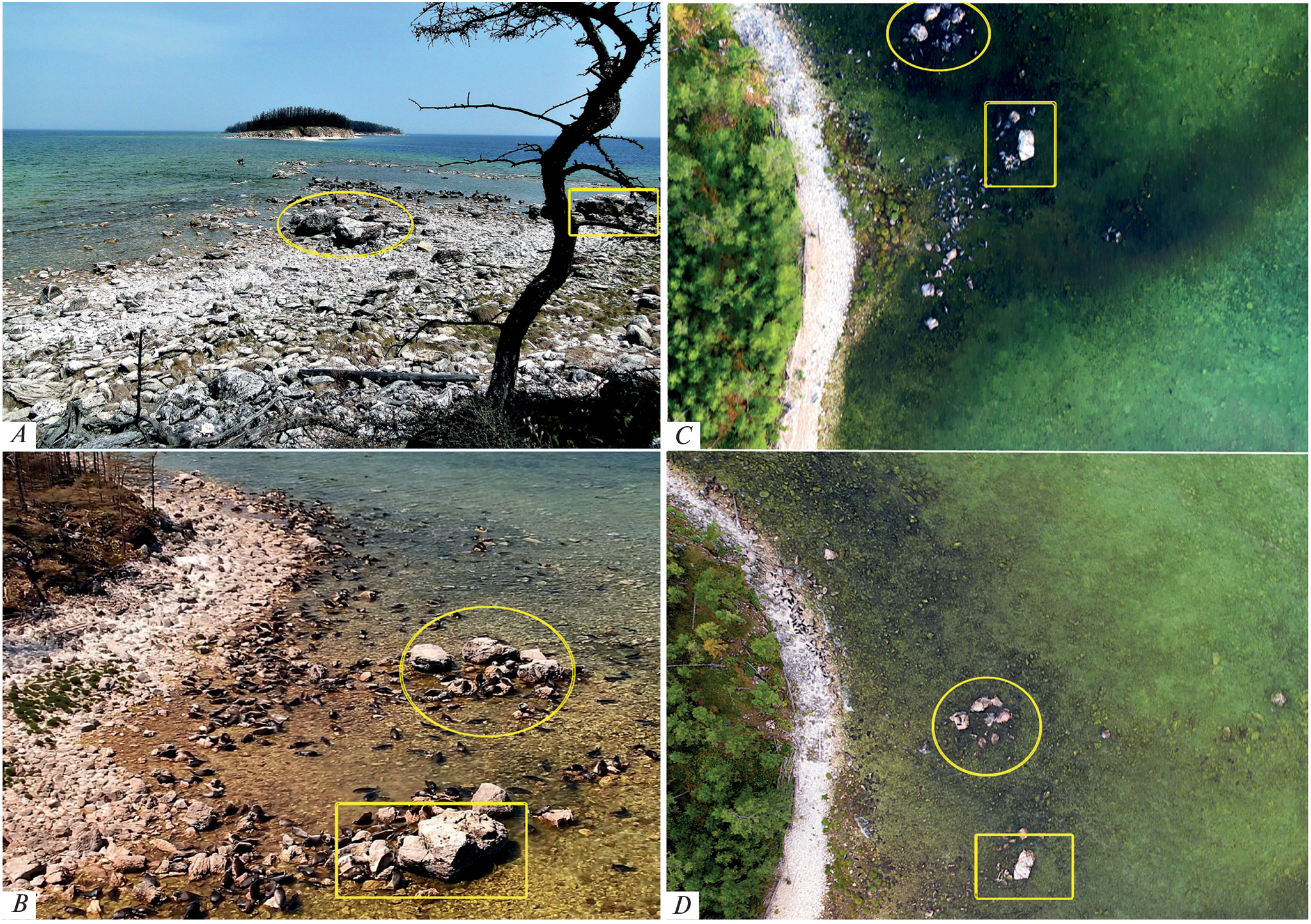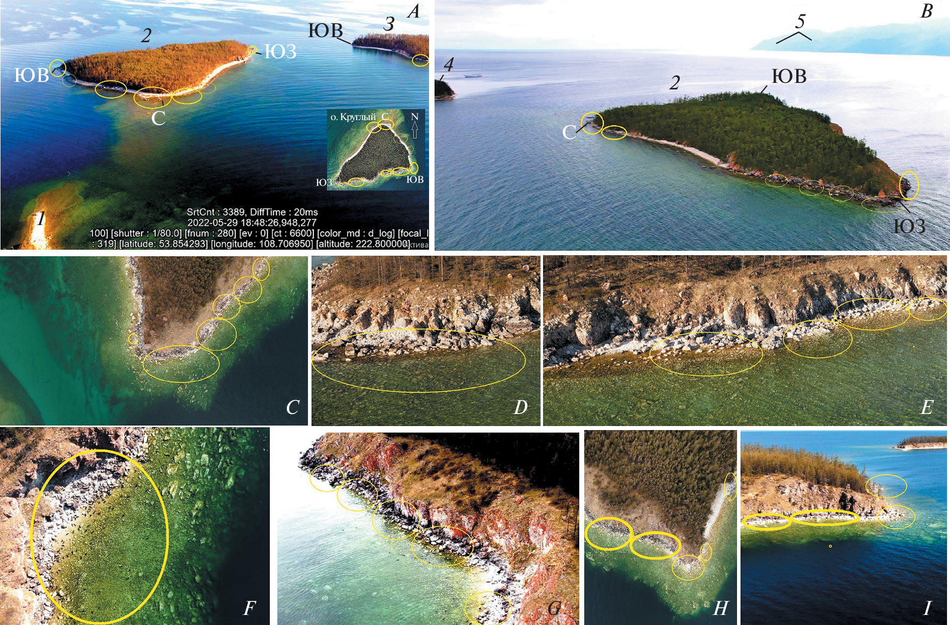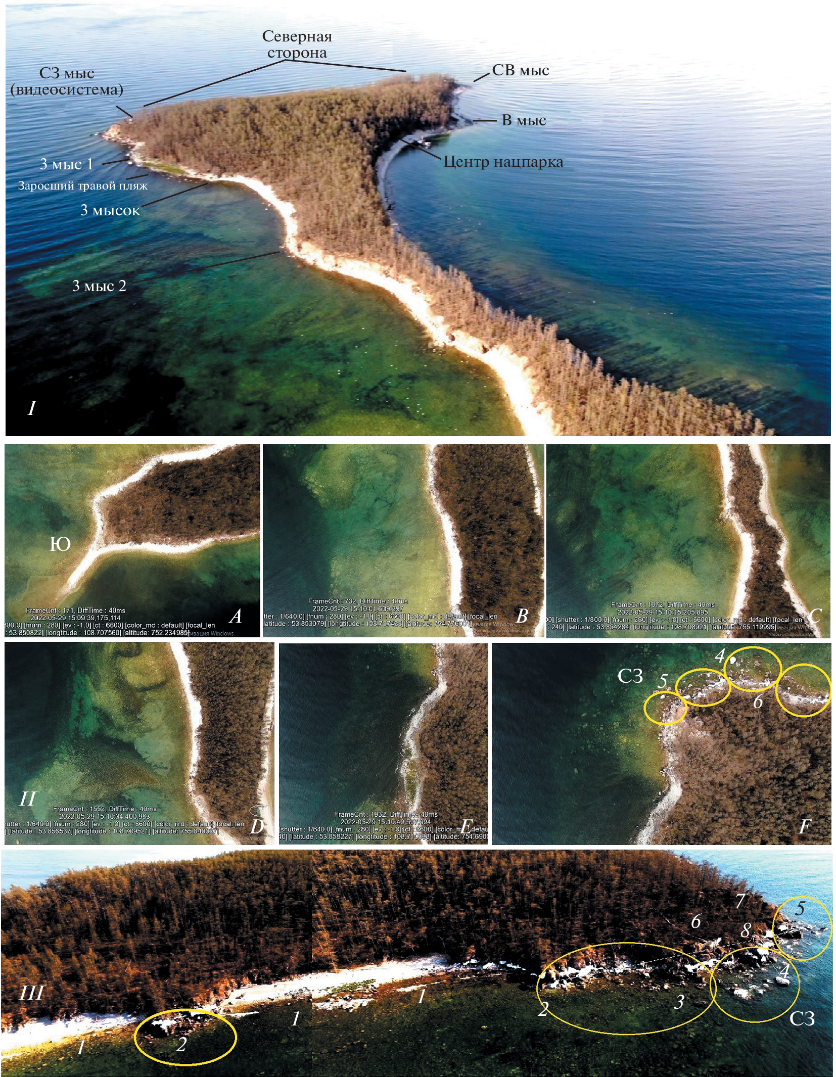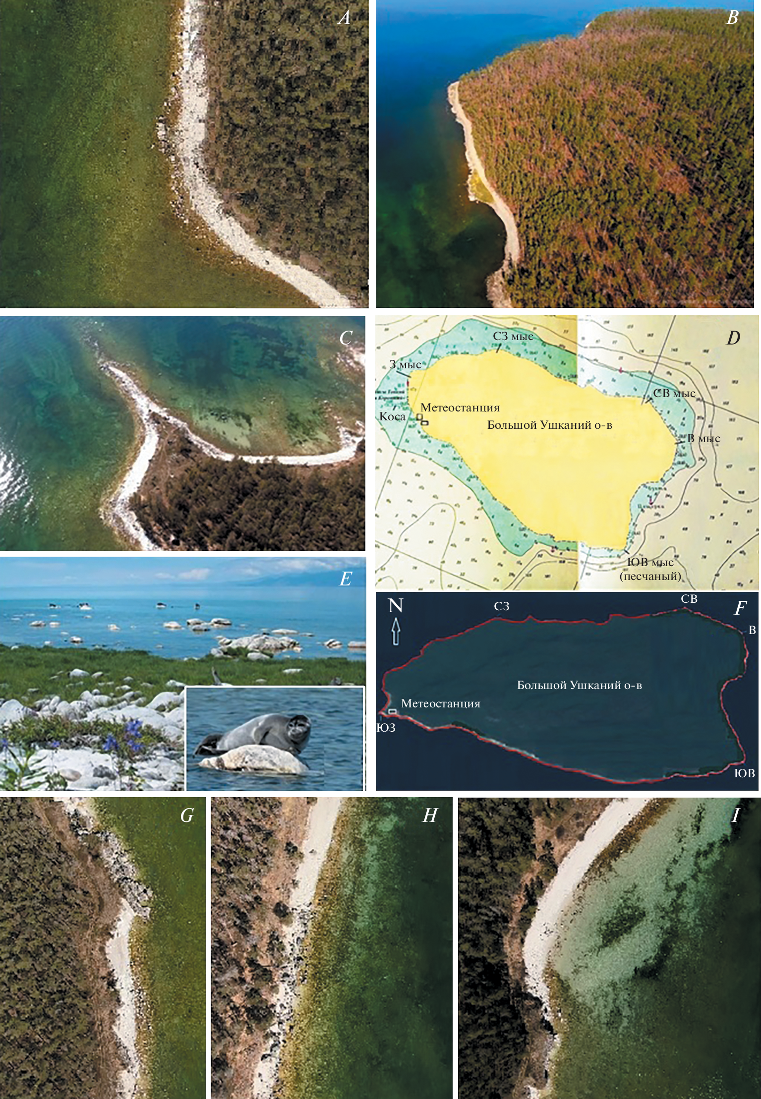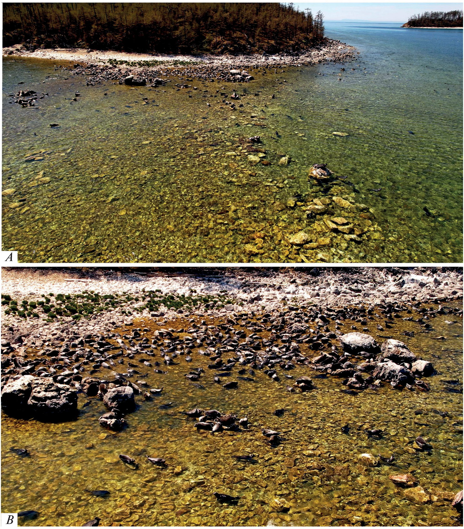Впервые приведено детальное описание береговой линии Ушканьих островов (озеро Байкал) с целью оценить использование берега байкальской нерпой (Pusa sibirica Gm.) в качестве лежбищ и роль этих лежбищ в годовом цикле тюленей. Для этого использованы видеоматериалы, полученные с помощью БПЛА фирмы “DJI” Mavic 2 Zoom и Air 2 S, и результаты многолетних полевых наблюдений. Полная съемка береговой линии всех четырех островов проведена 29 и 30 мая 2022 г. (при уровне воды 456.40 м над ур. м.), а также 12 и 24 августа (уровень воды, соответственно, 456.79 и 456.83 м над ур. м.). Показано, что по литологической характеристике на о-ве Большой Ушканий около 30% береговой линии пригодны для использования нерпами, однако этого в настоящее время не происходит. Среди трех малых островов у тюленей излюбленным местом для формирования залежек является о-в Круглый (по общей численности животных, зафиксированных на острове и в прибрежных водах), вторым по значимости является о-в Тонкий и третьим – о-в Долгий (здесь смонтирована стационарная видеосистема, передающая информацию в режиме онлайн). На всех островах определены координаты конкретных локаций залежек/лежбищ. В настоящее время около 35% протяженности береговой линии трех малых Ушканьих островов в той или иной степени используются нерпой под залежки. В современных климатических условиях лежбища на малых Ушканьих островах, по-видимому, играют исключительно важную роль для значительной части популяции (каждый сезон их посещают несколько тысяч особей), поскольку большинство других лежбищ и локаций, которые нерпы могли бы использовать в качестве таковых, подвержены сильному антропогенному воздействию.