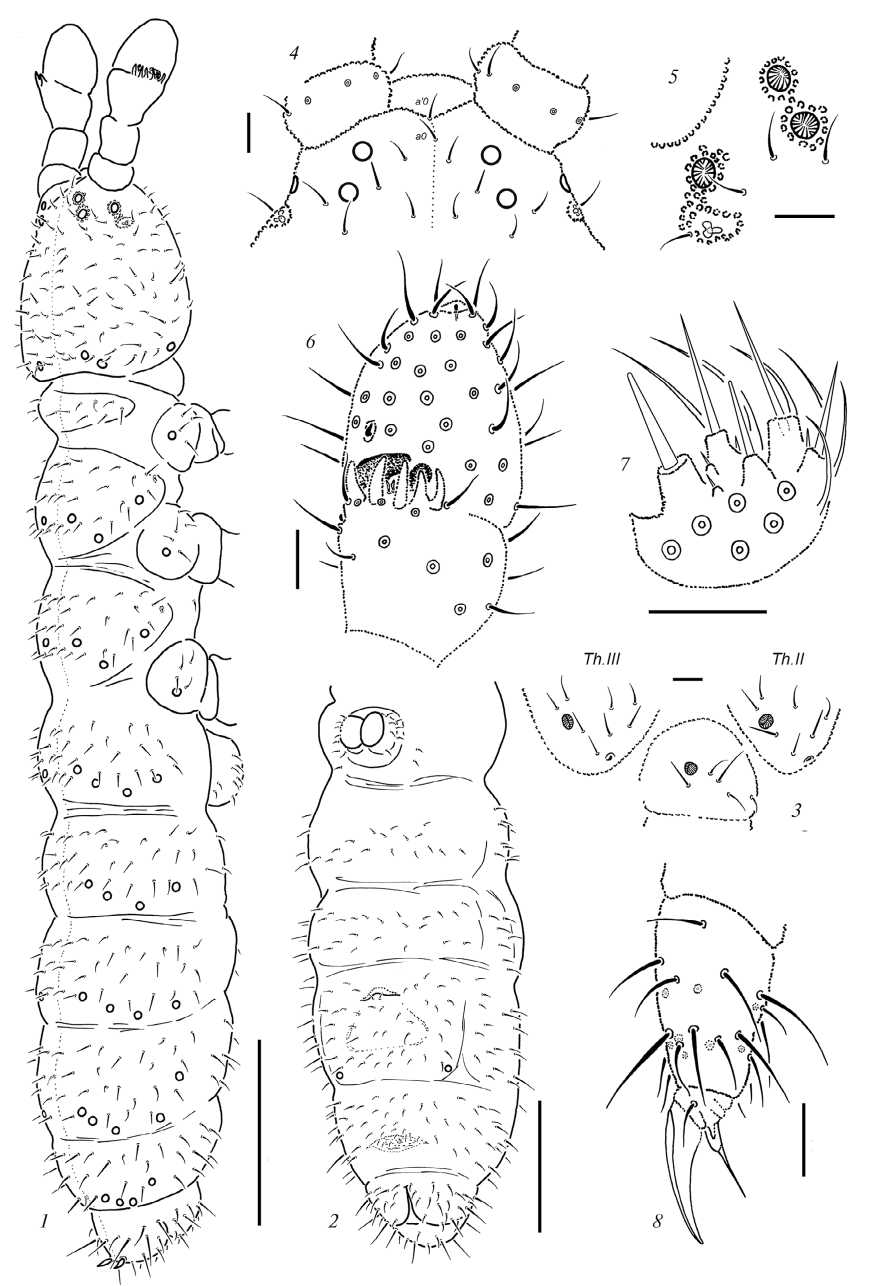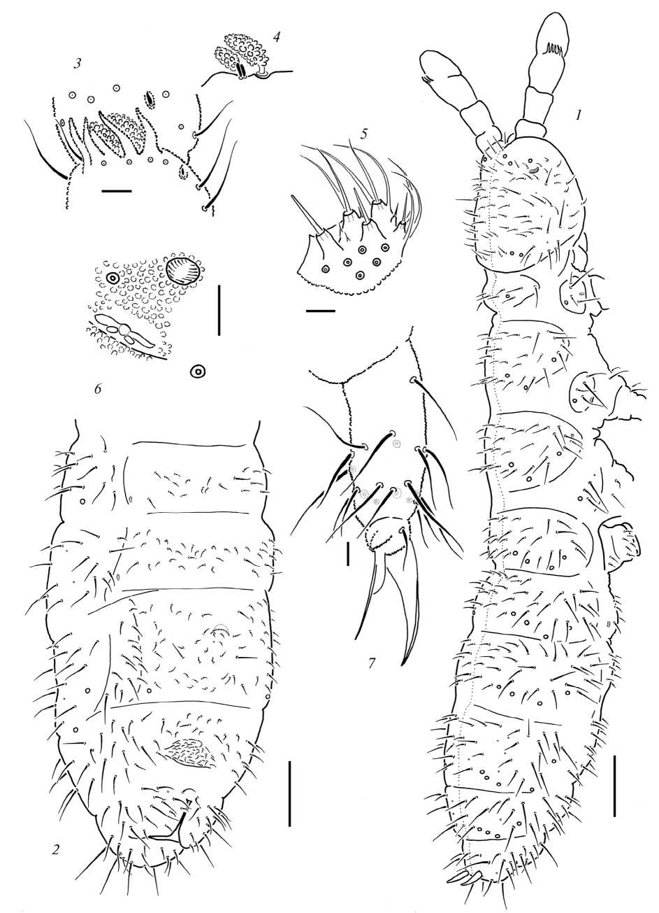 Dorsal setae poorly differentiated into macro- and microsetae, symmetrical in general (Fig. 5, 1). S-setae indistinct. Head with a single axial unpaired seta a0; d0 absent as usual for the genus. Setae p1 on head in front of setae p2. Th. I with 4(5)+4(5) dorsal setae. Lateral ms present on both Th. II and Th. III. Terga of Th. II–Abd. III each with 3–4 pairs of axial setae. On Abd. VI seta a0 similar in length to setae a2, setae a1 three times shorter than a0. Thoracic sterna without setae. Ventral chaetotaxy of abdomen as in Fig. 5, 2.
