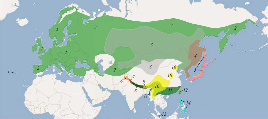 Рис. 1. Схема распространения снегирей, включая территории, посещаемые во время межсезонных перемещений: 1 – P. murina; 2 – P. pyrrhula; 3 – P. cineracea; 4 – зона совместного обитания (ЗСО) P. pyrrhula, P. cineracea и P. griseiventris; 5 – P. griseiventris; 6 – P. aurantiaca; 7 – ЗСО P. aurantiaca, P. nipalensis и P. erythrocephala; 8 – ЗСО P. nipalensis и P. erythrocephala; 9 – ЗСО P. nipalensis, P. erythrocephala и P. erythaca; 10 – P. erythaca; 11 – P. nipalensis; 12 – ЗСО P. nipalensis и P. erythaca; 13 – P. waterstradti; 14 – P. leucogenis.