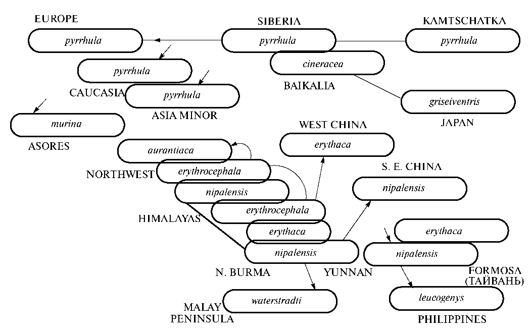 Из трудов, которые составляют основу современного представления о таксономии рода и созданы за последние сто с лишним лет, для анализа я взял две классические работы Бианки (1907) и Фауса (Voous, 1949), которые заслуживают наибольшего внимания при рассмотрении истории расселения снегирей.