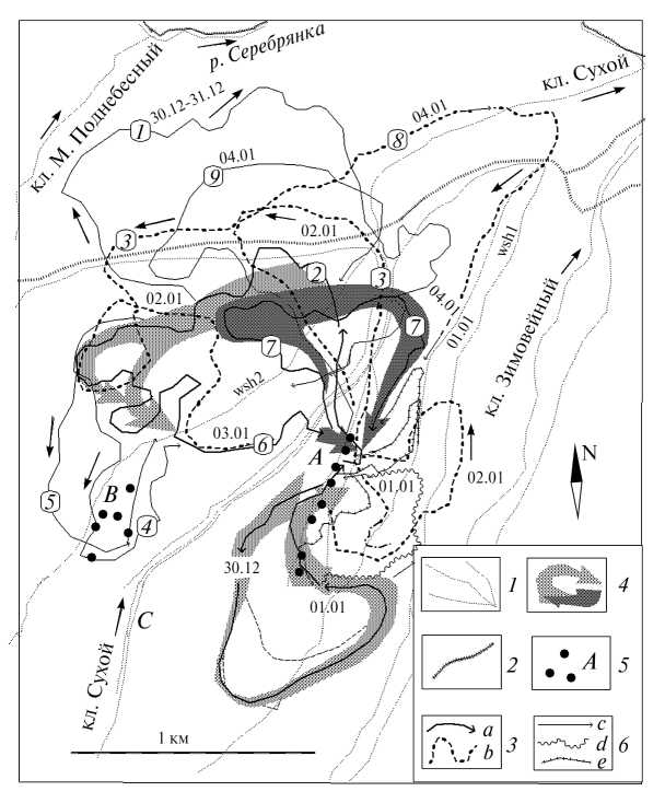 Рис. 1. Схема перемещений семейного союза и других групп, секача на ключевом участке “Зимовейный” с 28.12.2007 г. по 08.01.2008 г.; 1 – основные линии рельефа, wsh1 и wsh2 – гребни водоразделов); 2 – основные маршруты тигра вдоль оснований водоразделов по нашей тропе и у реки; 3 – пути переходов особи, которую тропили и которая находилась в составе материнской группы (a), а также примыкающего к материнской группе секача (b); 4 – направления последовательных переходов семейного союза, расширения стрелок показывают рассредоточение кабанов при сборе пищи; 5 – групповые лежки кабанов на стоянках А–С; 6 – переходы примыкающих к союзу групп особей второго и третьего лет жизни (с), взрослых самок без сеголетков (d), кабанов поодиночке (е); 30.12, 01.01 и др. жирным курсивом показаны даты перемещений семейного союза и некоторых других особей; цифры в овалах – пояснения в тексте.