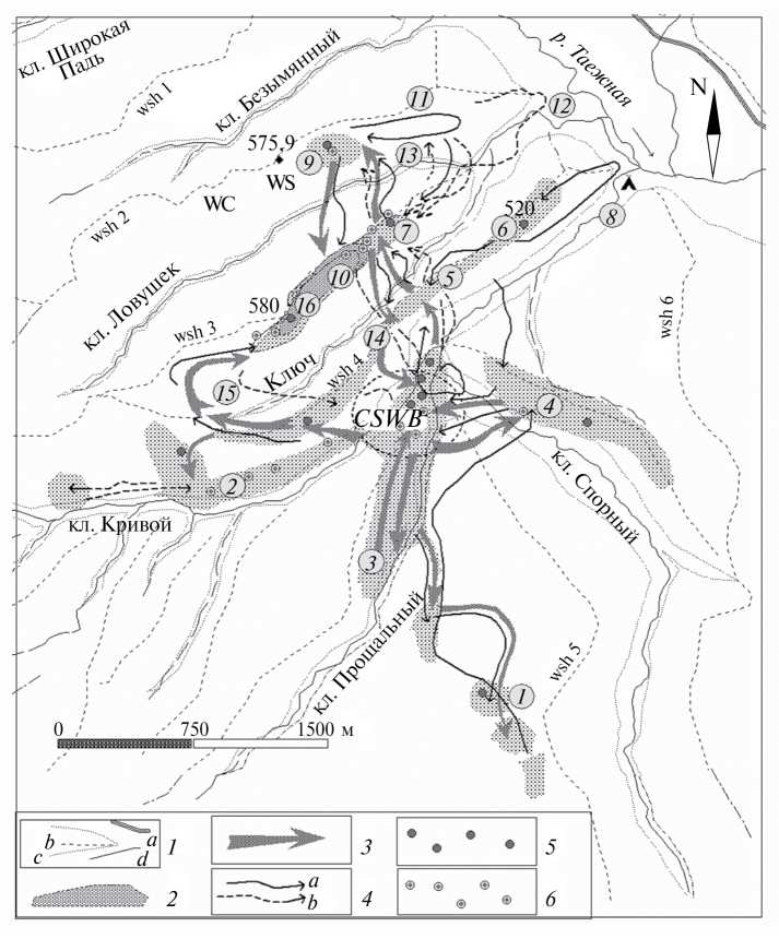 Рис. 2. Особенности использования кабанами “Нечетовского” участка зимой 2011–2012 гг., основные направления переходов материнских групп, секача и других групп в январе–феврале 2012 г. при обычных условиях залегания снежного покрова (до 17–28 см в середине февраля) и урожае ореха кедровой сосны 4 балла; 1 – автодорога (a) вдоль границы заповедника, гребни (b), подножия водоразделов (c), ключи (d): 2 – основные площади сбора пищи кабанами в кедровнике с дубом; 3 – перемещения семейного союза, семей; 4 – перемещения секача (а), малых групп и одиночек (b); 5 – многоразовые лежки; 6 – метки секача мочой, в т. ч. оставленные ранее; CSWB, WB – стоянки и места зимовок кабанов; цифры в кружках – последовательные позиции и переходы материнских и других групп, секача; объяснения в тексте; wsh 1, wsh 6 и др. – условные номера водоразделов; 575.9 и др. – абсолютные высоты гор.