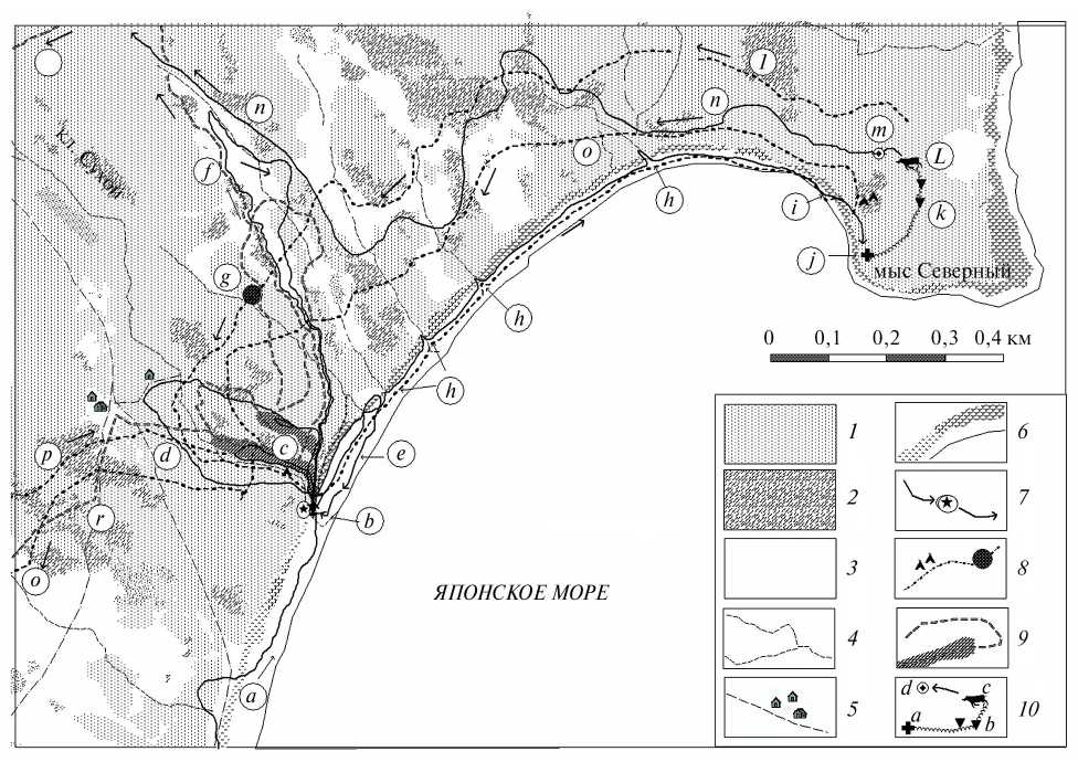 Рис. 3. Переходы кабанов во время охоты на них тигра самца с 5.03 по 7.03.2013 г. в прибрежных дубняках урочища Благодатное; 1 – дубняки и другие лиственные леса; 2 – дубняки с участием лиственницы и лиственничники; 3 – поляны и заболоченные участки, песчаные, каменистые пляжи по берегу моря; 4 – ключи; 5 – основные дороги, тропы, кордон и строения; 6 – земляные и скальные береговые откосы; 7 – переходы тигра, метки мочой рыси и тигра на комле сухого дерева; 8 – переходы и многоразовые лежки сеголетков, место спугивания (g в кружке) их тремя свиньями при бегстве от тигра; 9 – переходы трех свиней и участок их дневок, лежек; 10 – место добычи (а) тигром сеголетка, трек перетаскивания добычи (b), положение жертвы (с) и лежка тигра (d); другие обозначения и объяснения в тексте.