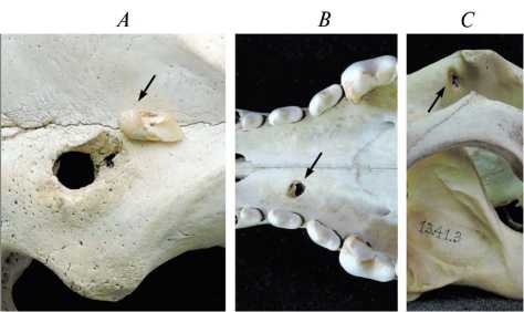Рис. 1. Фрагменты черепов волка с травмами, полученными в результате внутривидовых агрессивных контактов: A – череп № 13.90.1, стрелкой показана вершина обломившегося клыка; B – череп № 13.24, травма нёбного отростка правой верхнечелюстной кости; C – частично зажившее отверстие от клыка ниже и каудальнее заглазничного отростка на черепе № 13.41.3.