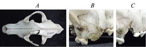 Рис. 2. Травмы на черепах волка, полученные при охоте на лося: A – череп волка № 13.166.1; B – фрагмент правой верхней челюсти волка № 13.148.1, латеральный вид; C – фрагмент правой верхней челюсти волка № 13.181.1, латеральный вид.