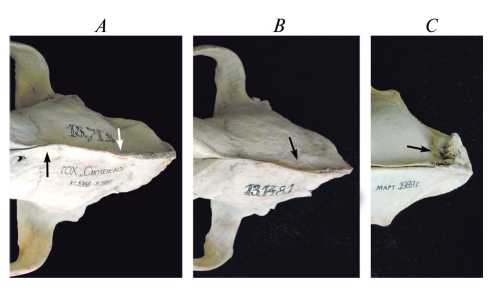 Рис. 4. Фрагменты черепов волка с деформацией сагиттального гребня, дорсальнй вид: A – череп № 13.71.3; B – череп № 13.148.1; C – экзостоз на черепе № 13.36.1.