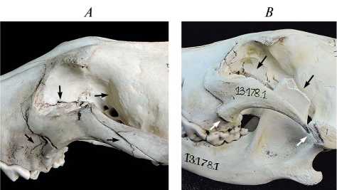 Рис. 8. Травмы, полученные волками в результате удара копытом обороняющегося лося в область зубного ряда, левый латеральный вид: A – череп № 1.11.2; B – фрагмент нижней челюсти черепа № 1.18.1.