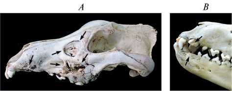 При изучении травм на черепах львов Замбии Ван Валькенбург и Уайт (Van Valkenburgh, White, 2021) выделили два их типа: тупые травмы (серьезные переломы со смещением костей или вдавленности костей), полученные при добыче крупных копытных; глубокие круглые углубления и линейные царапины, вызванные внутривидовыми конфликтами. Как и цитируемые авторы, мы понимаем, что классификация травм черепа волка носит в некоторой степени субъективный характер и не является однозначной. Однако сравнительный анализ разных травм на большой серии черепов позволяет считать, что предложенное нами разделение повреждений по их причинной обусловленности следует считать наиболее вероятным.