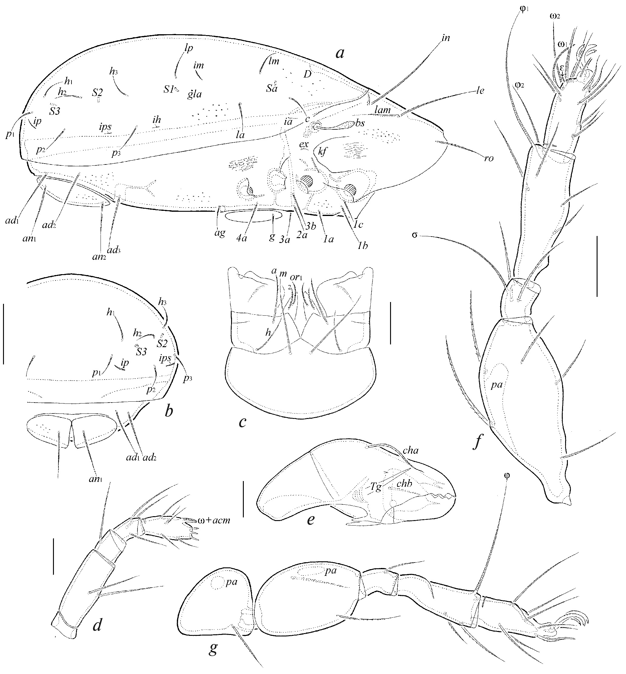 Abbreviations and notations. Prodorsum: lam = lamella; slam = sublamella; tlam = translamella; tu = tutorium; kf = keel-shaped ridge; ro, le, in, ex, bs = rostral, lamellar, interlamellar, exobothridial, bothridial setae, respectively; Ad = dorsosejugal porose area; D = dorsophragma. Notogaster: c, da, la, dm, lm, dp, lp, h, p = setae; Aa, A1, A2, A3 = porose areas; Sa, S1, S2, S3 = sacculi; ia, im, ip, ih, ips = lyrifissures; gla = opisthonotal gland opening. Gnathosoma: a, m, h = subcapitular setae; or = adoral seta; acm = palp seta; ω = palp solenidion; cha, chb = cheliceral setae; Tg = Trägårdh’s organ. Epimeral and lateral podosomal regions: 1a, 1b, 1c, 2a, 3a, 3b, 3c, 4a, 4b, 4c = epimeral setae; z = aperture of supracoxal gland; Am = humeral porose area; PdI, PdII = pedotecta I, II, respectively; dis = discidium; cir = circumpedal carina. Anogenital region: g, ag, an, ad = genital, aggenital, anal, adanal setae, respectively; iad = adanal lyrifissure; Amar = marginal porose area. Legs: Tr, Fe, Ge, Ti, Ta = trochanter, femur, genu, tibia, tarsus, respectively; pa = porose area; e = famulus; d, l, v, ev, bv, ft, tc, it, p, u, a, s, pv, pl = setae; ω, σ, j = solenidia.