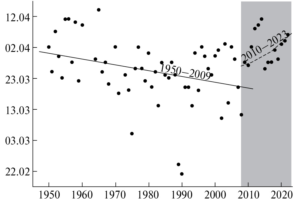 Рис. 1. Даты перехода среднесуточных температур воздуха через 0 °С в 1950–2023 гг. Положительный тренд, характерный для периода 1950–2009 гг. (Волков и др., 2013), изменился в 2010–2023 гг. (выделен серой областью).