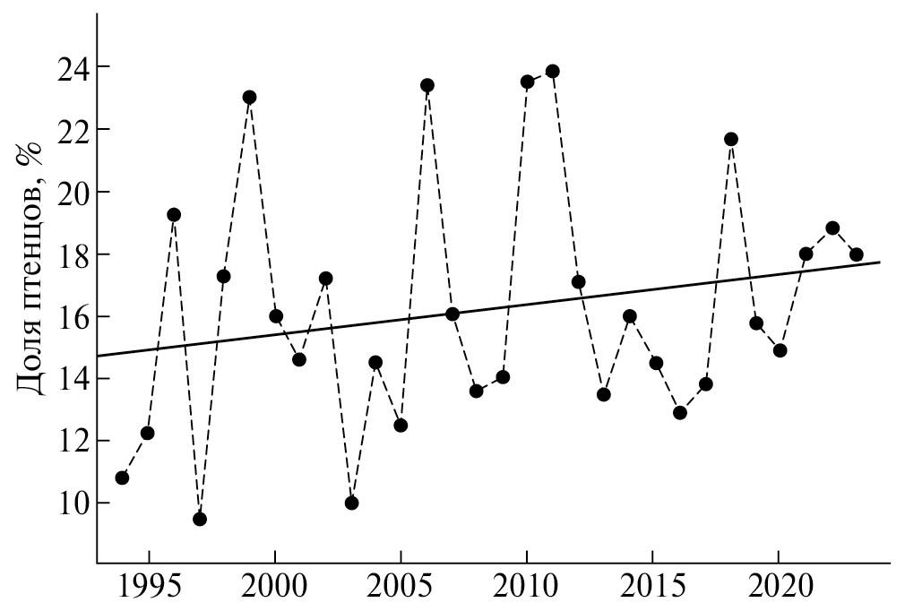 Успешность размножения. От сезона к сезону доля птенцов в предотлетном скоплении колебалась от 9.5 до 23.9 %, составляя в среднем 16.1±4.1 % (медиана 15.4, n = 30). Доля молодых постепенно увеличивалась, но эта тенденция слабая (Манн–Кендалл тест: τ = 0.14, p = 0.28; рис. 3).