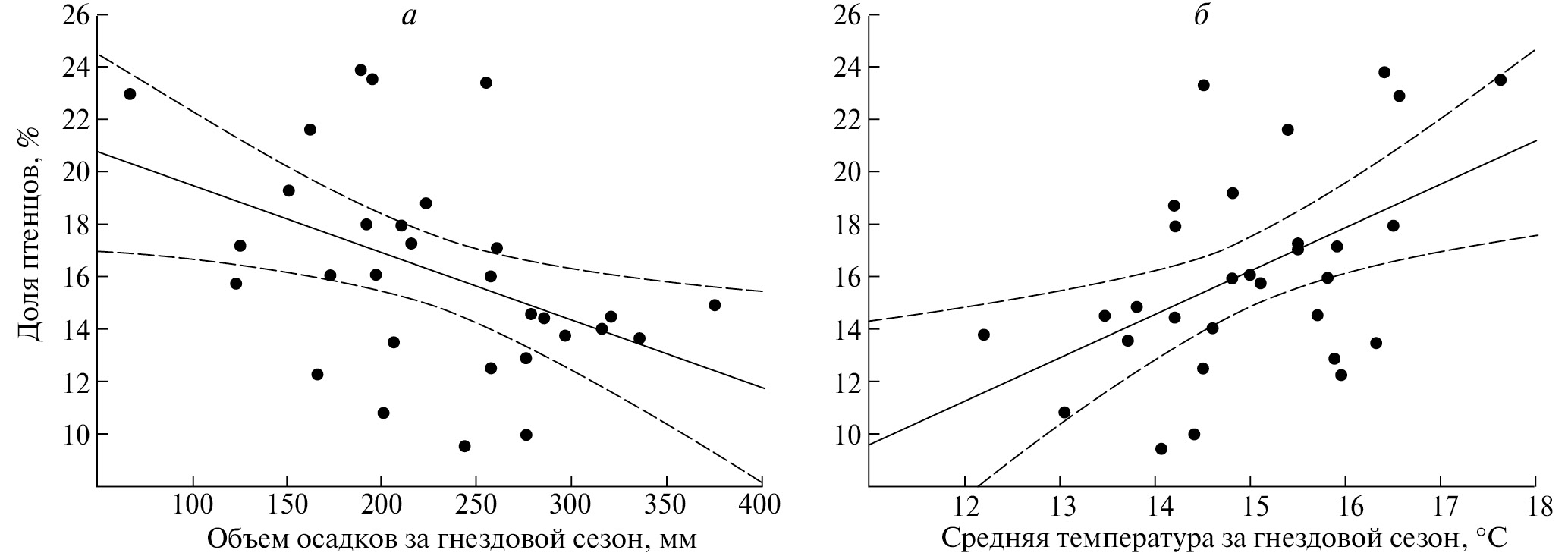 Больше всего птенцов (12.3–23.9 %, среднее±SD: 18.7 %±4.2, n = 10) было в годы с комбинацией высоких температур и небольшого количества осадков. В годы с небольшим количеством осадков и низкими температурами доля птенцов меньше (10.8–19.3 %, среднее±SD: 16.2 %±3.4, n = 6). Еще значительнее доля птенцов сокращается в годы c большим количеством осадков: как при относительно высокой температуре воздуха (12.9–17.1, среднее±SD: 14.9 %±2.1, n = 3), так и при низкой (9.5–16.0 %, среднее±SD: 13.3 %±1.9, n = 11). Самой неблагоприятной комбинацией для серых журавлей оказалось сочетание низких температур и большого количества осадков, в такие годы доля птенцов была минимальной (рис. 6б). Различие выборок подтверждается статистически (критерий Краскела–Уоллиса: H3;30 = 9.7, p < 0.02). Попарное сравнение выборок для сезонов с высоким и низким количеством осадков показало достоверную разницу между ними в результативности размножения (критерий Манна–Уитни: Z = –2.9, p < 0.003). Различия сезонов, сгруппированных по температуре, также показывает достоверную разницу между годами с высокими и низкими температурами (Z = –2.2, p < 0.028).