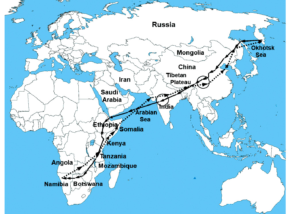 Кукушки из Амурской обл. (Соколов и др., 2023; сайт www.movebank.org) и Южной Кореи (Lee et al., 2023) также огибают Тибетское нагорье и Гималаи с юга, мигрируя в направлении к Индии. Кукушки, обитающие на севере Монголии и в районе оз. Байкал, тоже избегают лететь над Тибетским нагорьем и высокогорными Гималаями, вначале они мигрируют на юг через пустыню Гоби, простирающуюся на 1600 км с юго-запада на северо-восток и на 800 км с севера на юг, а затем на юге Китая поворачивают на запад и летят через Мьянму и Бангладеш в Индию (сайт https://birdingbeijing.com/the-mongolia-cuckoo-project/).