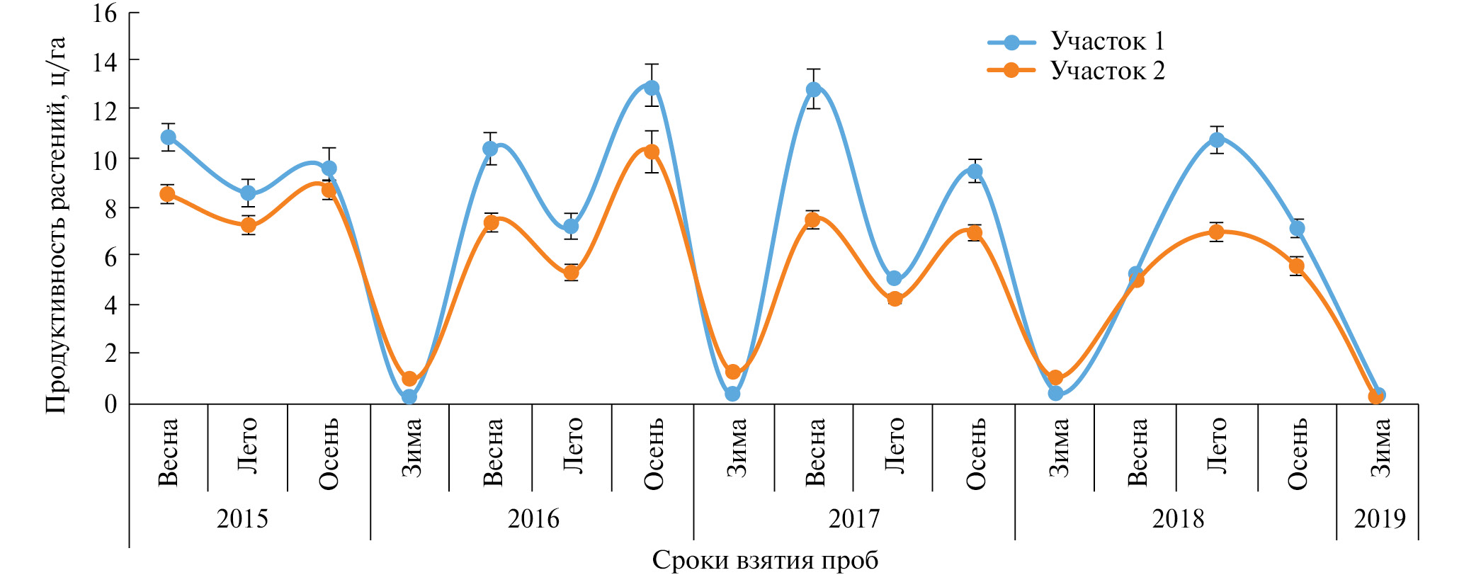 Как видно из рис. 2, во все годы исследований весной в период бурной вегетации растительности и зимой в период прекращения вегетации растительности продуктивность на обоих опытных участках практически не различается. В то же время в летний период во все годы исследований продуктивность на песчаных барханах (участок 1) заметно выше, чем на участке опустыненной степи (участок 2). В меньшей мере такая закономерность характерна и для осени.