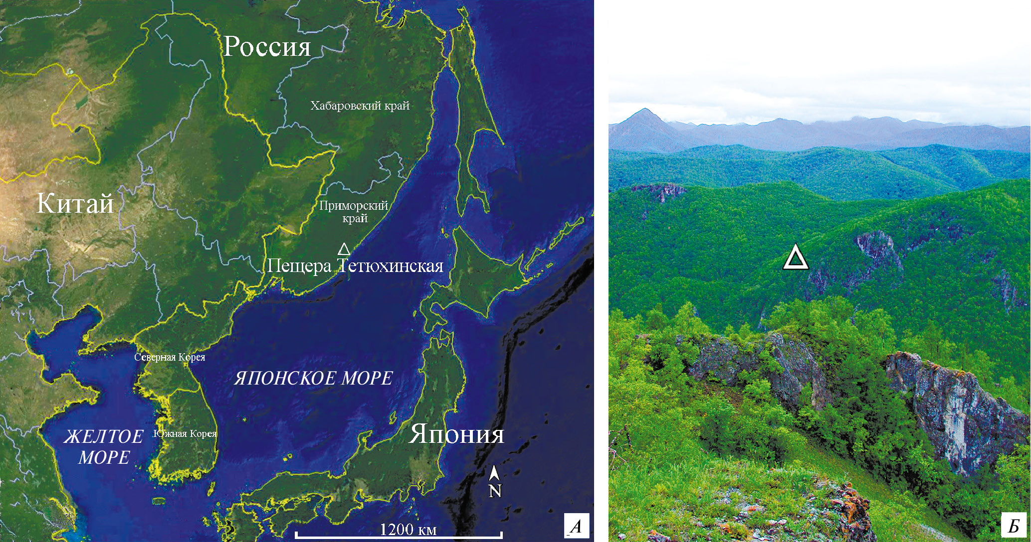 Рис. 1. Расположение пещеры Тетюхинская юго-восточнее хребта Сихотэ-Алинь (А) на Google-карте. Треугольником показано местонахождение пещеры (Б). Фото М. П. Тиунова.
