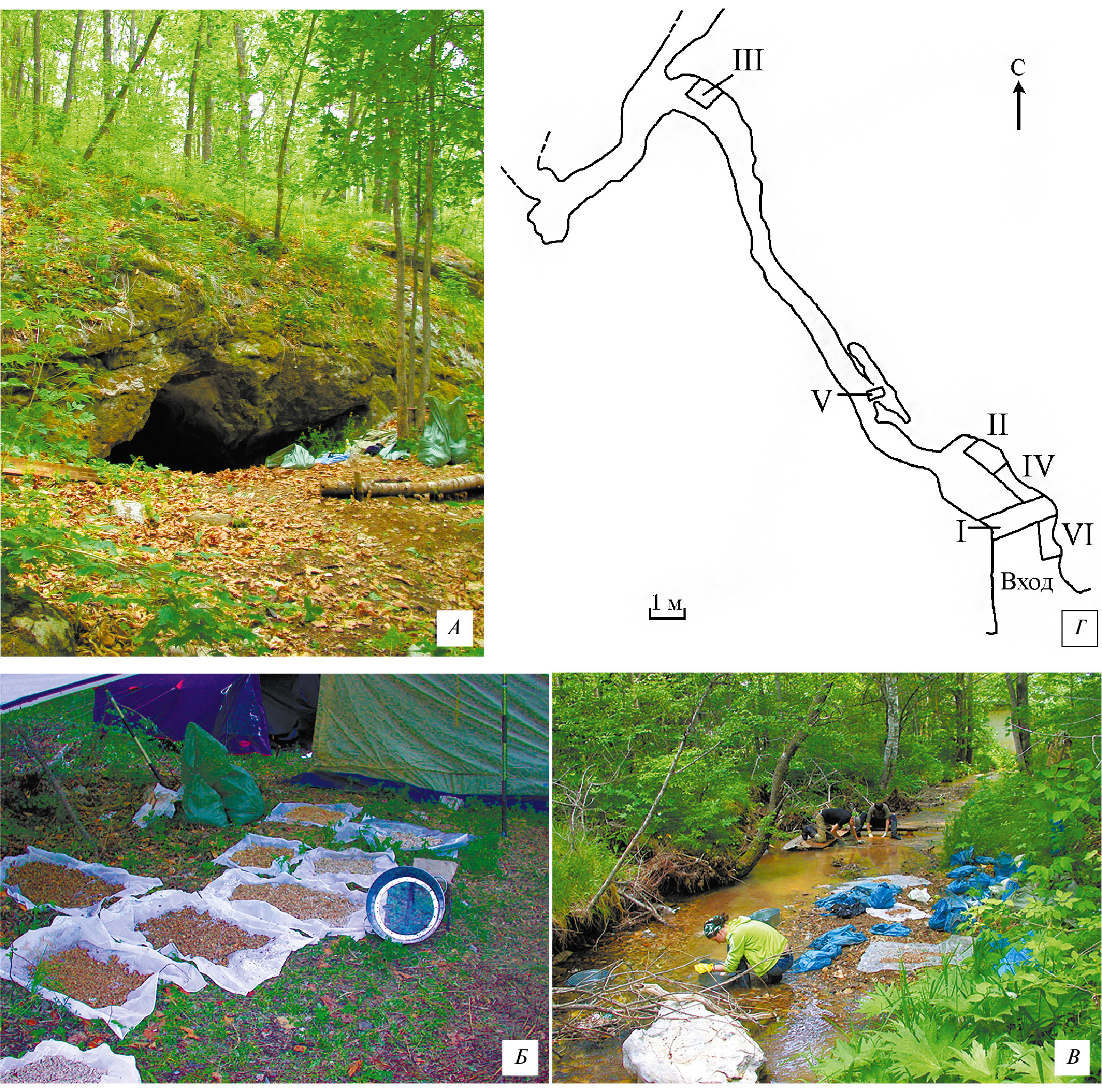 Рис. 2. Вход в пещеру (А); просеивание осадка, промывка и сушка отобранных проб на фаунистические остатки (Б, В); план пещеры (Г). Фото М. П. Тиунова. План пещеры составлен Д. А. Космач, Б. Е. Панасенко и Г. А. Исаевой (30.08.2011). Римскими цифрами обозначены номера шурфов.